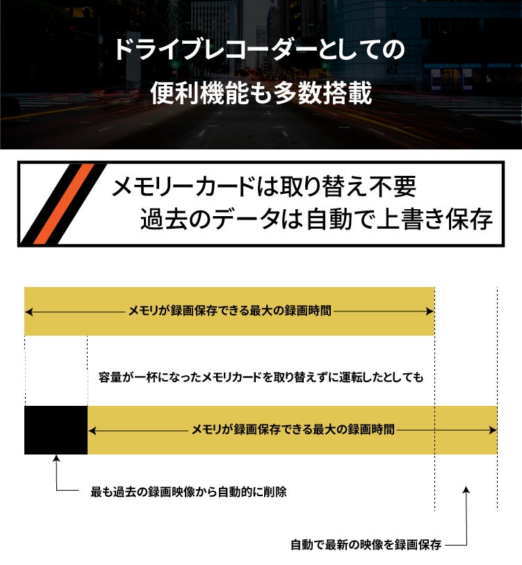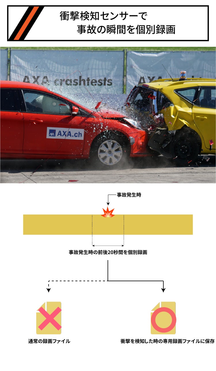 エンジンがOFFの場合でも衝撃検知センサーは稼働していますので、車に衝撃があった場合にはすぐに録画が開始されます。