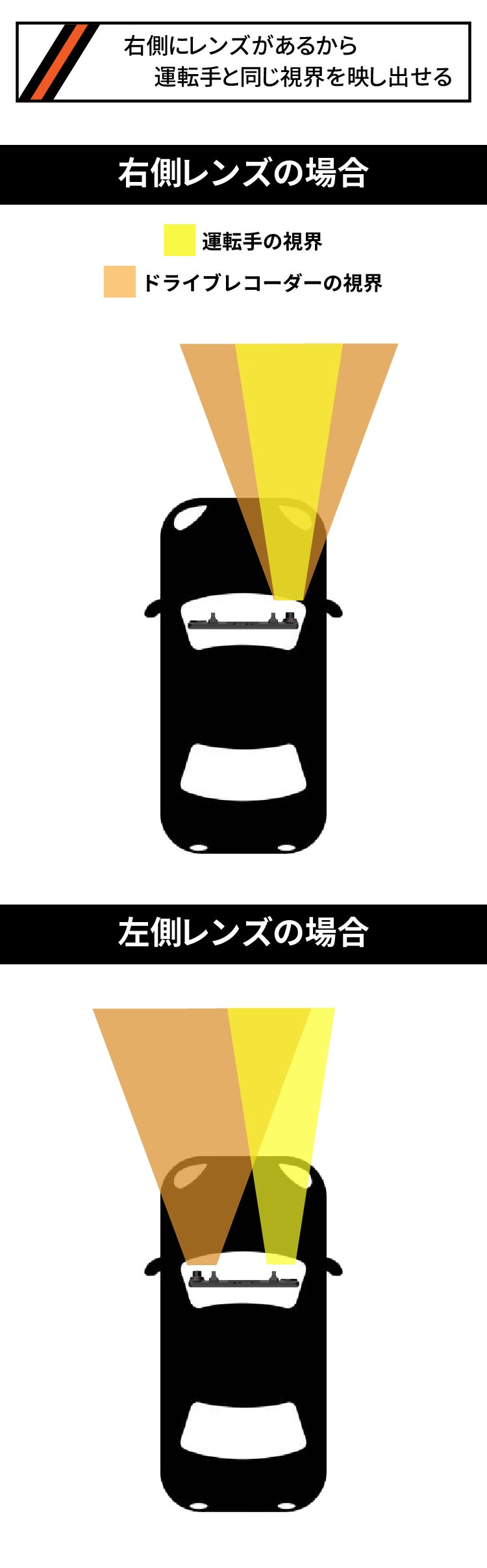 GEEDSドライブレコーダーは日本車に対応して製品右側にカメラレンズがついているため運転手と同じ視界を映し出すことができます。