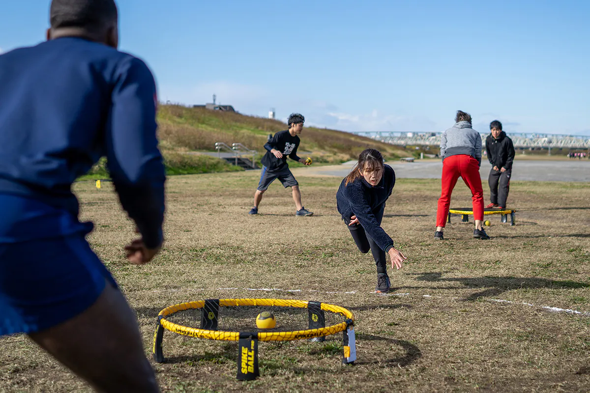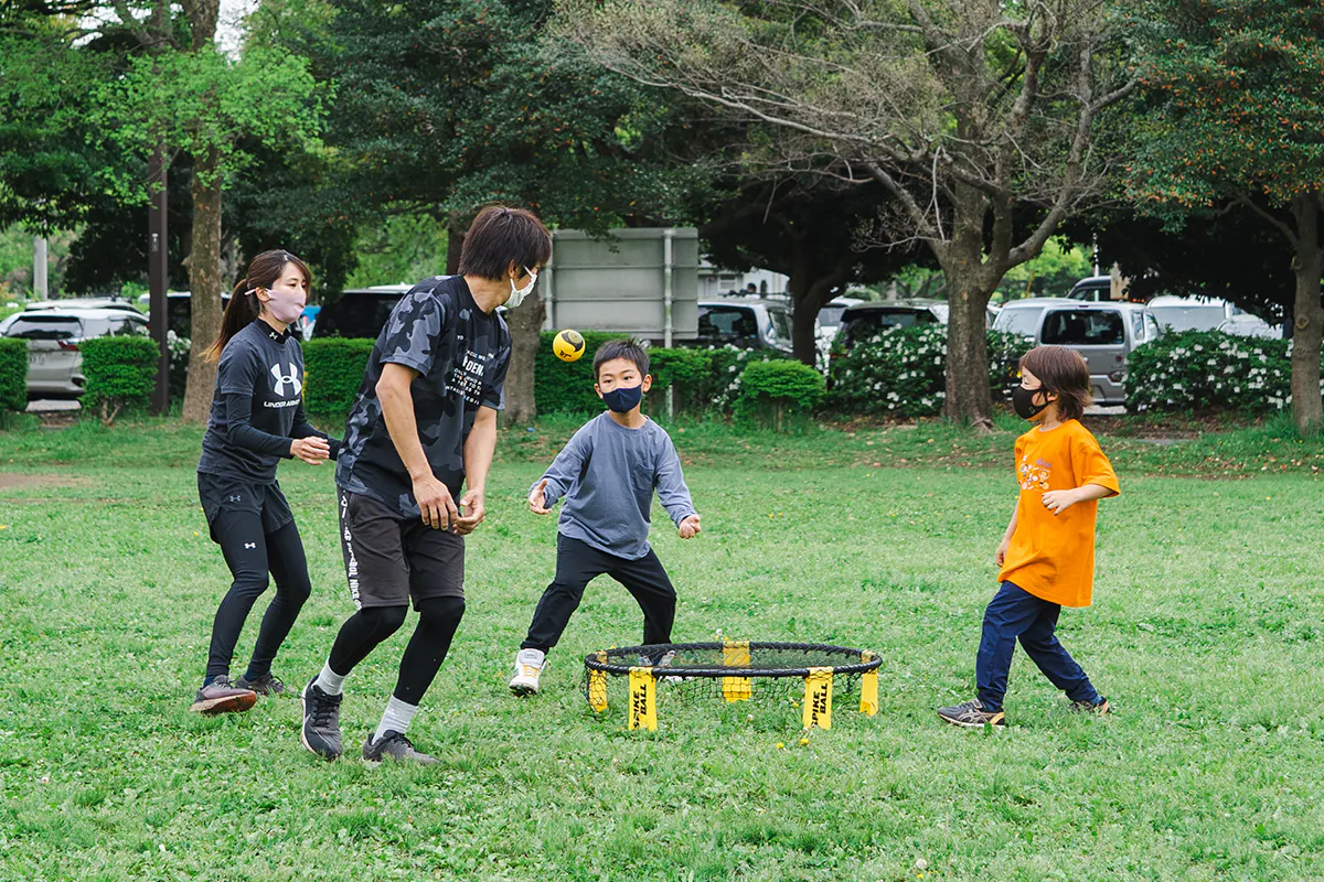 2008年アメリカで発祥し、専用の円形のネットとボールがあれば、場所を選ばず手軽に始めれるスポーツです。ルールは、ビーチバレーに似ていて、2対2で対戦する競技です。中央にある円形のネットを囲みネットにボールをバウンドさせて打ち合いをし返せなかったペアが失点になります。ルールはバレーボールに似ていて、一方のペアのサーブからゲームがスタート。ネットに当たって跳ね返ったボールを、レシーバー側は3回タッチする間にネットにバウンドさせて返球を繰り返します。3回の間にネットにバウンドできない、ボールをネットの周辺のリム(フレーム)に当てる、ネットに2バウンドしてしまうと相手の得点になります。