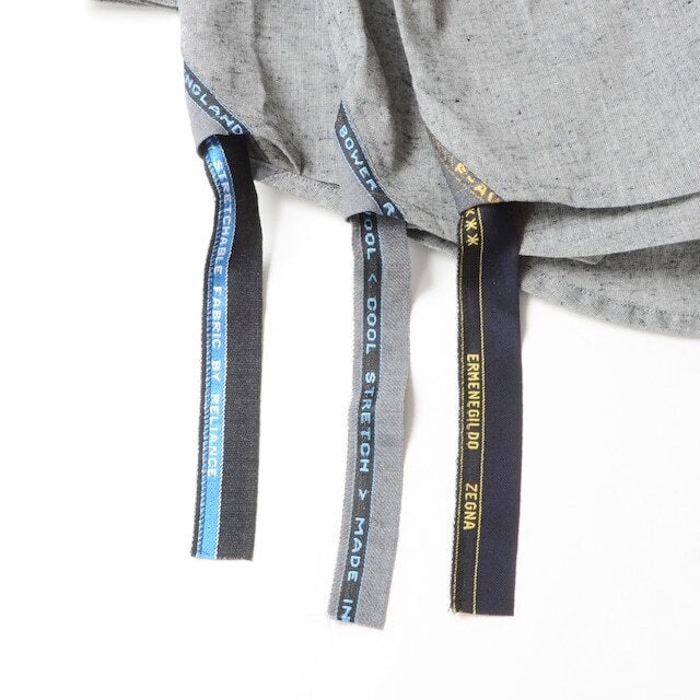 イタリアはカノニコ、ロロ・ピアーナ、エルメネジルド・ゼニア、レダ、ドラゴetc。イギリスはドーメル、バウワーローバック、ウィリアムハルステッド、ジョン・フォスター、カイノック、バルマー&ラムetc。ベルギーはスキャバル。日本は葛利毛織、御幸毛織。多種多様な高級生地をミックスさせています。*端材の為、裁断の際の位置により1枚1枚表情が異なります(耳が付くモノ、付かないもの。選べませんので予めご了承ください。)