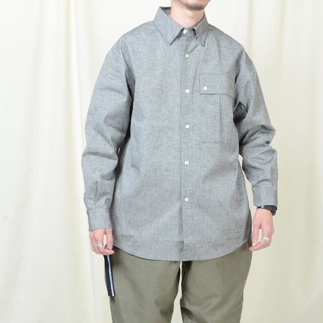 しっかりした厚手の綿を使用したリメイクシャツ。シャツの羽織的な雰囲気で着ることができ、長い期間着られるアイテムです。シルエットはオーバーシルエットになっており、襟部分はボタンダウン仕様。ボリュームのあるビックポケットで胸元に存在感を出しスマートフォンもすっぽり入るデザインです。