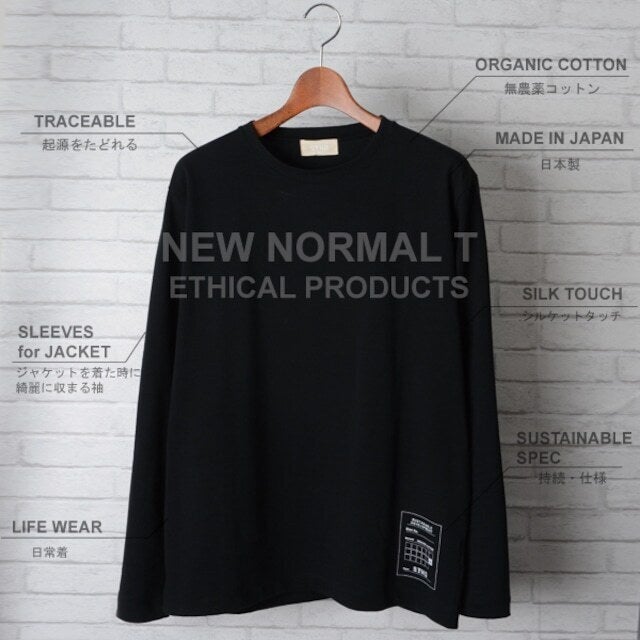 20/1天竺でしなやかで肌触りがよく、オーガニックコットン本来の良さを分かってもらえるようシンプルに仕上げ、ワンポイントプリントでアクセント。大人のTシャツをテーマにしているので、JK用Tシャツとしてアームホールが細く、綺麗に収まる仕様になっています。ジャケットコーディーネートのインナー用として、袖山を高くし袖口を細く修正することでJKを羽織っても袖の中で袖口がゴワつかない使用になっています。