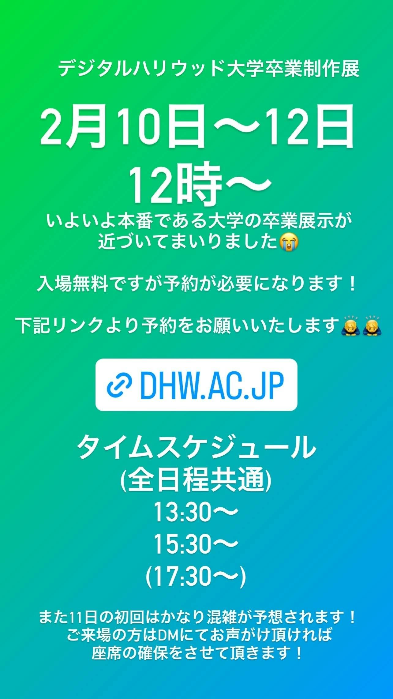 2023/01/30 12:52皆様こんにちは!監督の小瀧です。大学の卒業展示がもうすぐになりました!作品も完成し、皆さんにお見せする日がようやく来たことにまだ実感が湧きません、、。卒業制作展の詳細は以下になります。日時:2月10日~12日(12時~)場所:デジタルハリウッド大学御茶ノ水キャンパス「可愛い子は旅をする」上映スケジュール(全日程共通)初回 13時30分〜2回 15時30分〜(3回 17時30分〜)ご来場は予約が必要になります。下記リンクよりご予約いただけます!(入場は無料です)https://www.dhw.ac.jp/p/sotsuten/その他卒業展示についてわからないことがあればこちらのクラウドファンディングのメッセージ、もしくはInstagramにご連絡頂ければと思います!たくさんの方のご来場お待ちしております! もっと見る#10 撮影風景 part.6