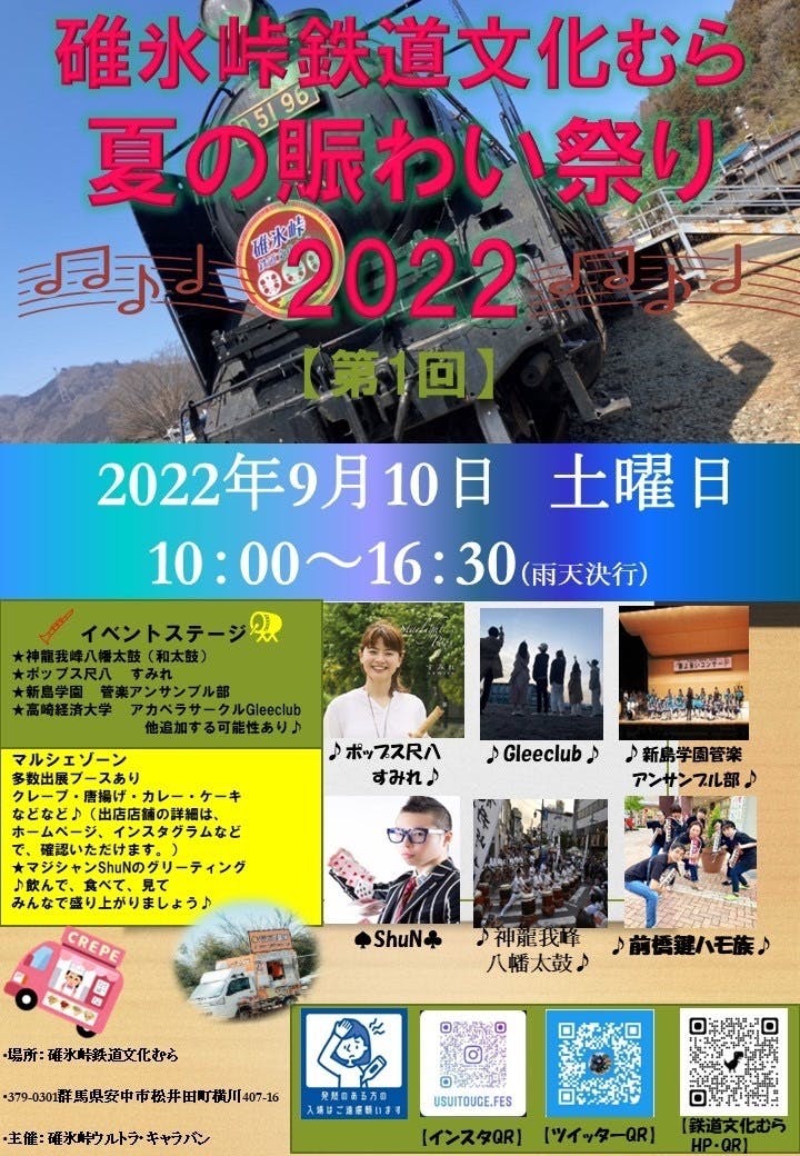 私たちは、碓氷峠ウルトラキャラバンというイベント団体でございます。今回企画しているイベントをきっかけとして発足した団体です。碓氷峠鉄道文化むらにて音楽×鉄道×マルシェを通じたイベントの開催を通して、地域活性化やコロナ禍により制限された各種活動の場の提供を目標に掲げ取り組んでまいります。