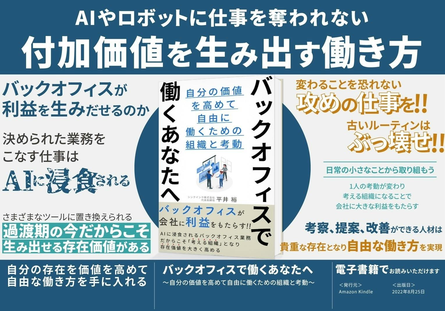 今回、多くの人に「バックオフィスの働き方を変えることで、会社もそこで働く人の存在価値も上げることができる」と知っていただきたく、電子書籍の自費出版を決めました。