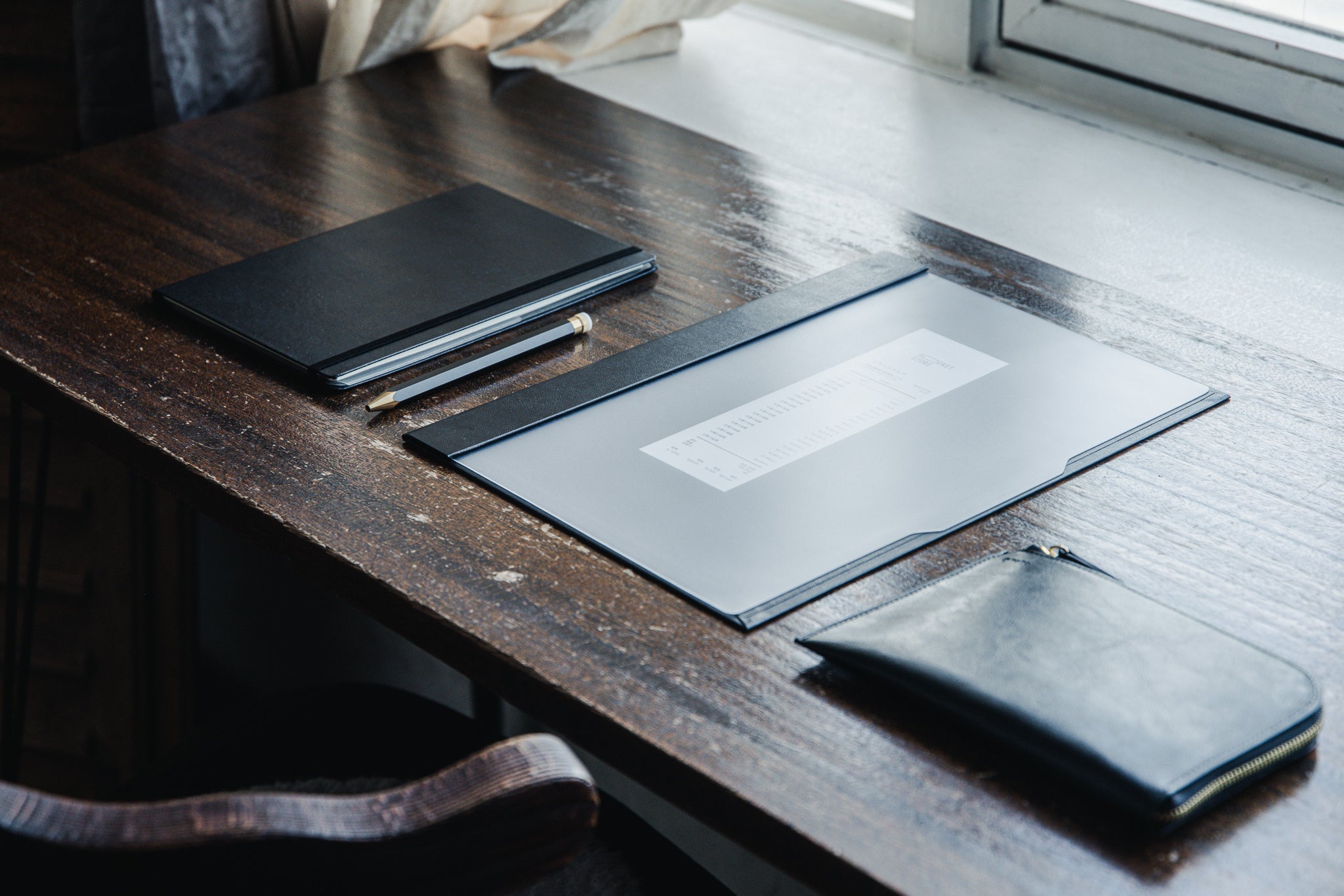 手帳のような黒いハードカバー製のバインディングボードと、日本の老舗デスクマットメーカーが手掛ける低反射シートが、快適なレシートスキャン体験へ皆様を導きます。