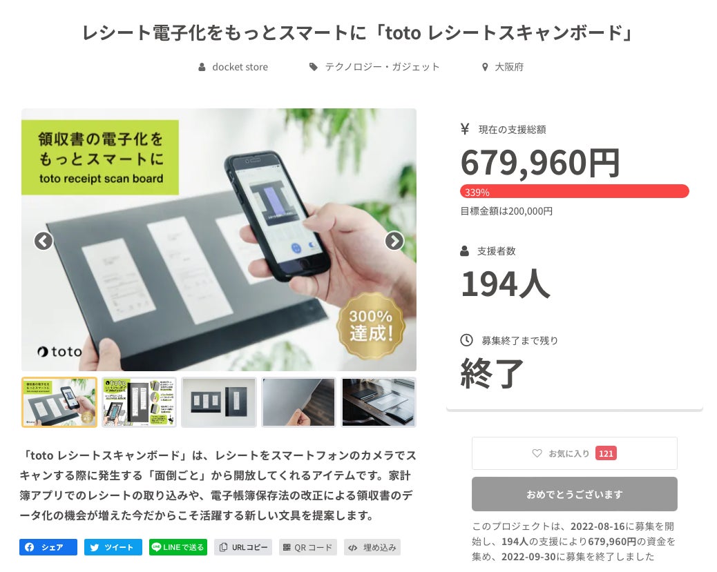 2022/09/13 10:36「レシート電子化をもっとスマートに「toto レシートスキャンボード」」プロジェクトオーナーのdocket store店主の山下義弘でございます。皆様のご支援をいただき、目標の20万円に対し、300%を達成することが出来ました。改めて感謝申し上げます。ありがとうございます。プロジェクト期間もいよいよ後半戦となりましたが、さらなる達成率を目指して9月30日の終了まで挑んでまいりたいと思います。そして、ぜひよろしければこのプロジェクトについて、興味の有りそうなお知り合いに共有いただいたり、SNSでの拡散を頂ければ幸いです。もう既に実施いただいている方も多くいらっしゃいますが、改めてお願い申し上げます。どうぞ皆様、今後もこのプロジェクト「toto レシートスキャンボード」の挑戦をあたたかく見守って頂ければ幸いです。 もっと見る