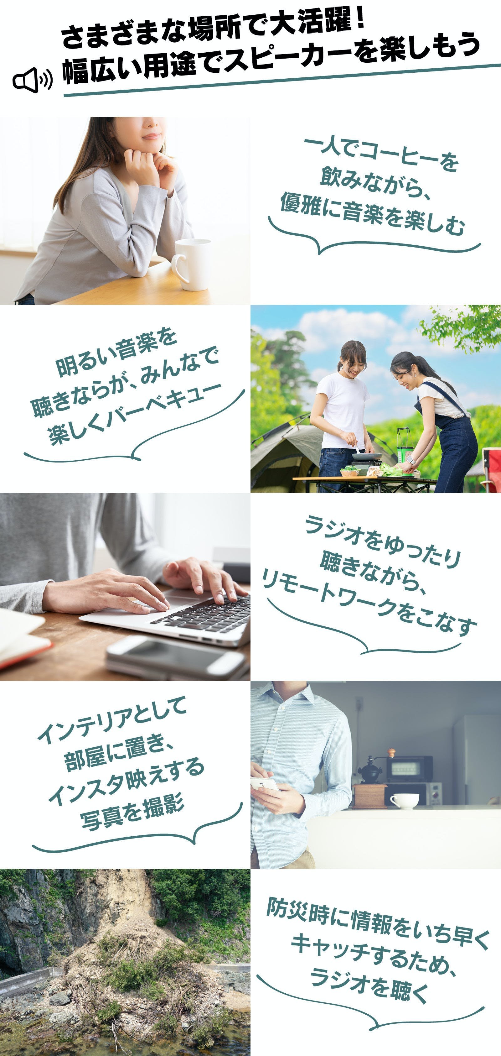 さらにFMラジオとしても機能するため、あらゆる場面で便利にお使いいただけます。
