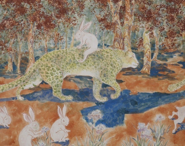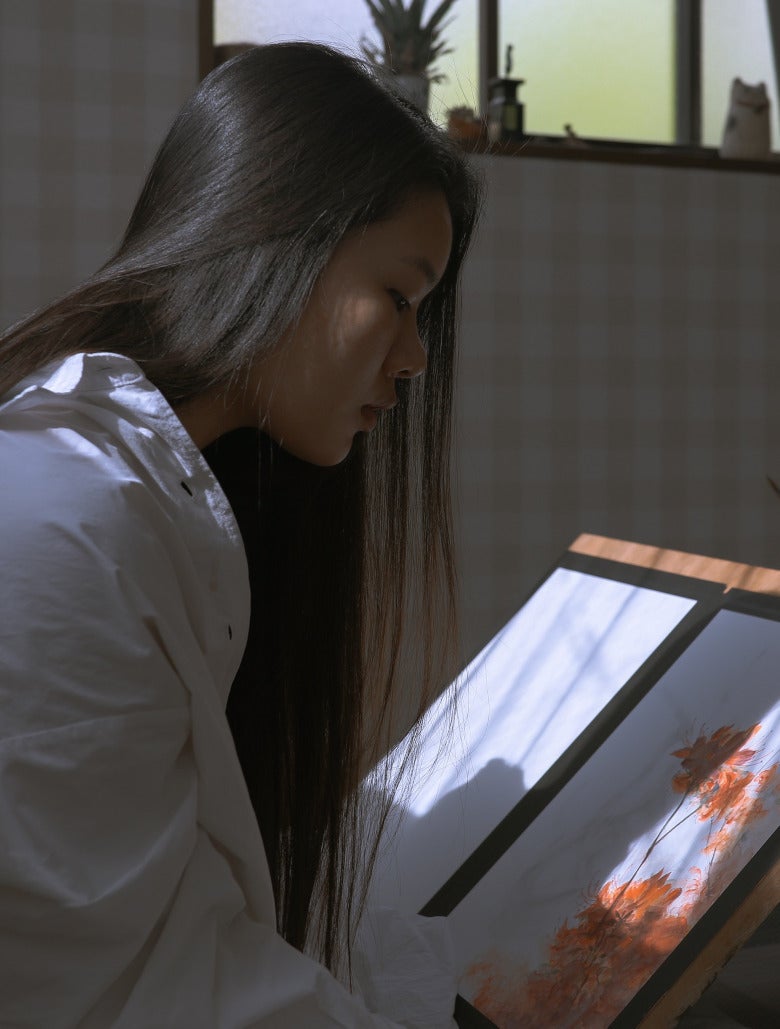 若い時に中国で80歳くらいのおじいちゃん先生の元で伝統的な水墨画を学んだそうです。そこで中国古来の伝統的な水墨画の技法を習得しましたが、でもリナさんは内心「私はまだ若いから、もっと若い感覚で新しい絵が描きたい!」と思っていたそうです。そんな気持ちを抱えて、日本の美大に留学して現在日本画の制作を行っています。