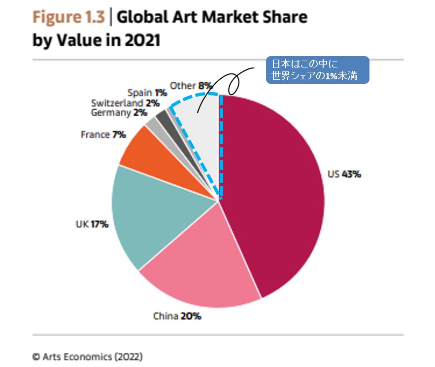 「アーティストの約9割はアートで生計を立てられていない」 その現状をご存じでしょうか?(参照:Casieの2021年インターネット調査)その理由のひとつは欧米と比べて、日本のアートマーケットが小さいこと。日本のマーケットシェアはグローバル全体の1%未満。72%を占める欧米が主流でアジアでは中国が20%でトップです。日本の1%未満は先進国としてはかなり少ない数値です。(参照:「The Art Basel and UBS Global Art Market Report」)