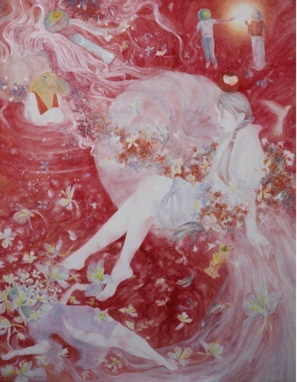 西洋絵画の油絵やアクリルと比べて、静的な質感の出る岩絵具ですが、リナさんの作品は若いエネルギーに溢れています。大学のアトリエでの制作風景、日常的なちょっとしたイベントや人との交流。現実と想像が入り混じったような夢日記のような作品は、リナさんのアーティストとしての日々の成長が垣間見られるようにも感じられ、新しい作品を見るのもとても楽しみになります。
