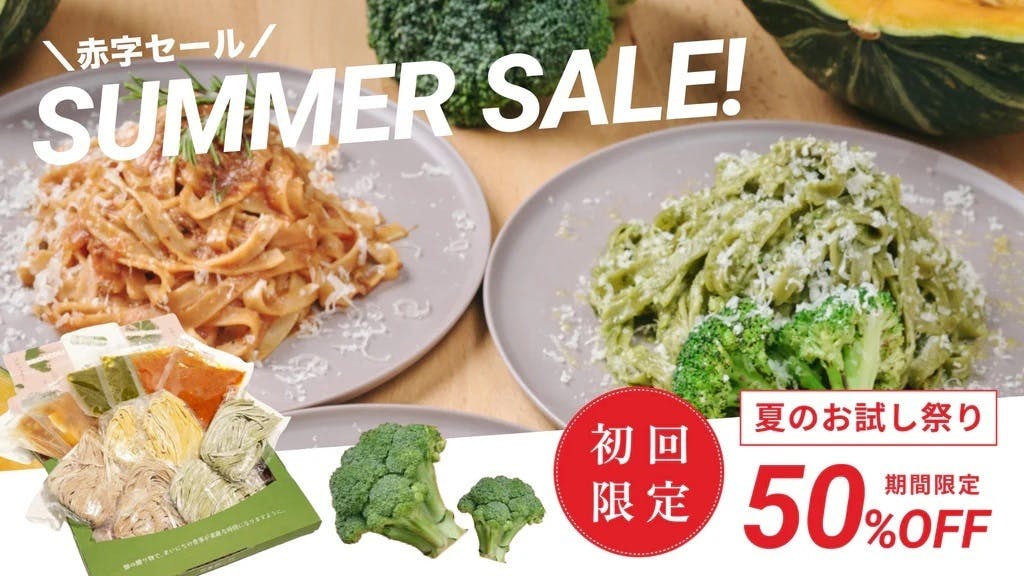 2024/08/22 18:30いつもまるごと野菜の生パスタ『畑の贈り物』を応援いただきありがとうございます!8月も後半に差し掛かっていますが、皆さまいかがお過ごしでしょうか?今年は特に暑い日々が続いているので夏バテ気味の方も多いかと思います!この夏を乗り切るために、そして栄養不足・野菜不足を解消するために、お客さま大還元キャンペーンを実施いたします!はじめての方も、ぜひこの機会にお試しください♪ 【期間限定】お試しセットを見てみる→ キャンペーン概要はじめての方もお得にお試しいただける期間限定セットと、50%OFFの特大割引キャンペーンを実施いたします。キャンペーン実施期間:2024年8月21日(水)〜8月31日(土)※数量に限りがありますので、予告なく終了する場合がございます。 ◯お試し6食セット通常8食以上からのご注文ですが、期間限定で6食にてお試しいただけるセットをご用意しました!さらに、今回は20%OFFの特別価格でお届けランチ/ディナー問わず、手軽においしくつくれる生パスタを6食セットにしてお届けします。(※2種類のパスタ麺が3つずつ入っています。)グリーンスムージー生パスタ(ブロッコリー・小松菜)×3食緑黄色野菜生パスタ(かぼちゃ・にんじん)×3食通常は最低購入数8食(定価3,040円)からですが、今回は6食でお試しいただける上に、さらに20%OFFの1,824円にてご購入いただけるオトクなセットです!【期間限定】お試しセットを見てみる→ ◯定期便50%OFF!SNSキャンペーンまた、SNS限定でアナウンスするクーポンコードを入力すると「定期便」が初回50%OFFに!詳細は各SNSをチェックしてください♪公式Instagramはこちら公式X(旧Twitter)はこちら 生パスタの特徴「健康も、地球への配慮も、無理なく続ける」をコンセプトに、毎日食べられる手軽なパスタで、”おいしい”をお届けします。◎1日の不足野菜(約70g)をたっぷり摂取◎パスタを食べるだけでフードロス削減◎アレルギーの方も食べれる卵不使用の生パスタ麺(プラントベース)◎茹で時間たったの2分の簡単調理なに1つ無理することなく、”おいしくて嬉しい”が大切です。毎食つねに栄養を考慮した献立を考えたり、ダイエットや美容のために厳しい食事制限をしたり。そんな方にとって、『畑の贈り物』の生パスタが少しでもお役に立てたら、という想いを込めてつくっています。 キャンペーンや商品に関するご質問やご不明点は、「公式LINE」もしくは公式サイトの「お問い合わせ」よりお気軽にご連絡ください。 もっと見る