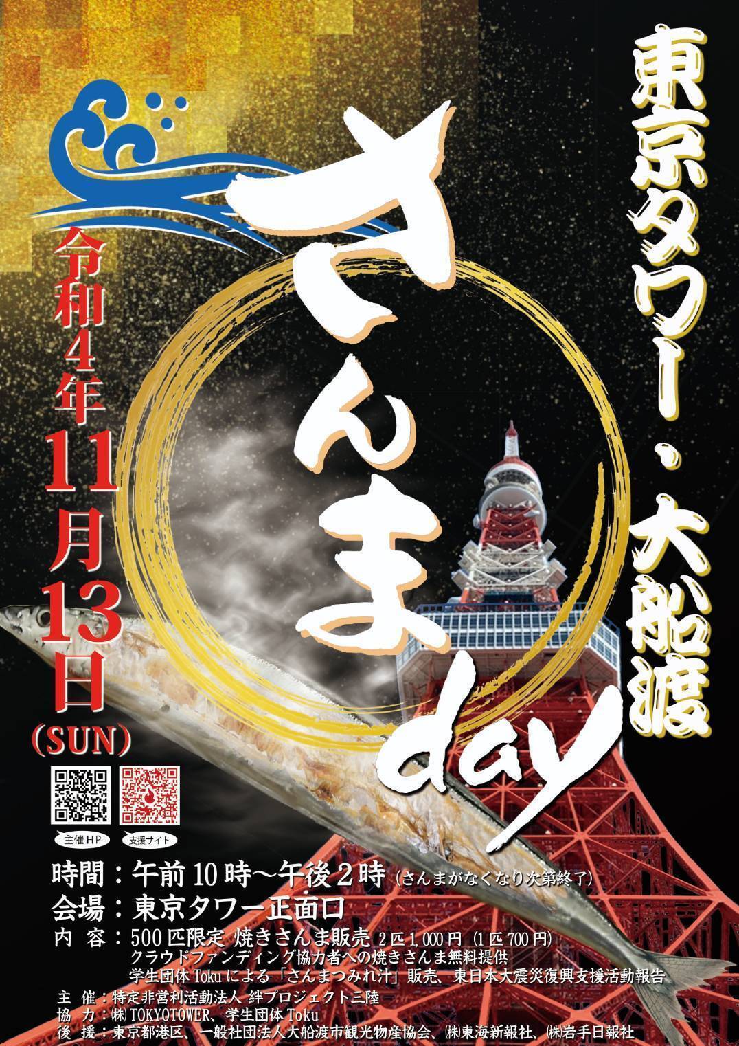 11月13日(日)に東京タワーを会場に開催した『東京タワー・大船渡さんまDay』が無事に終了いたしました。大船渡市長が実行委員長を務めていた三陸・大船渡サンマまつりが終了し、3年ぶりに東京タワーを会場に今回のイベントを開催するまでに、様々な葛藤、不安もありましたが以前からのサンマまつりのファンの皆様の声、その声に応えたいというサンマ焼き師たちの想いが今回の開催に繋がりました。今回挑戦したクラウドファンディングは、達成できるか不安でしたが予想をはるかに上回る、たくさんの方々からご支援をいただきました。ご協力いただいた皆様、本当にありがとうございます。皆様のご支援のお陰で会場にお越しの皆様からは、「毎年来ていたので楽しみにしていた!」「無くなるのはさみしい!」「有料でいいから毎年開催してほしい!」と嬉しいお声をいただきました。今回、このイベントを開催することが最優先事項でしたが、開催できたことにより、さんま焼き師の皆さんももちろん私自身も次回の開催意欲に火が付きました。ご支援いただいた皆様、協力してくださった皆様の想いも大切にして参りたいと考えております。またご協力いただきました株式会社TOKYOTOWER様、学生団体Toku様、後援をいただきました港区様、(一社)大船渡市観光物産協会様、東海新報社様、岩手日報様、協賛をいただきました鎌田水産㈱様、司会進行・アカペラライブで会場を盛り上げてくださったアカペラユニットXUXU(シュシュ)様、そして合唱に駆けつけてくれた皆様、バッチリ澤内先生、心を込めて炭火でサンマを焼いてくれた大船渡市さんま焼き師の皆様、応援に駆けつけてくださった焼き師の皆様、本当にありがとうございます。そして会場にお越しの皆様、お手伝いいただいた皆様、在京大船渡人会の皆様、三陸でご縁をいただき駆けつけてくださった皆様、本当にありがとうございます。そのほかにも本当にたくさんの方々から、ご支援ご協力をいただき、無事に東京タワー・大船渡さんまDayを終了することができました。心から感謝しております。本当にありがとうございました。手探りでスタートした今回のイベントですが、多くの方々から継続をとのお声をいただきました。皆様のお声、お気持ちに応えられるよう努めてまいります。今後とも何卒宜しくお願いいたします。