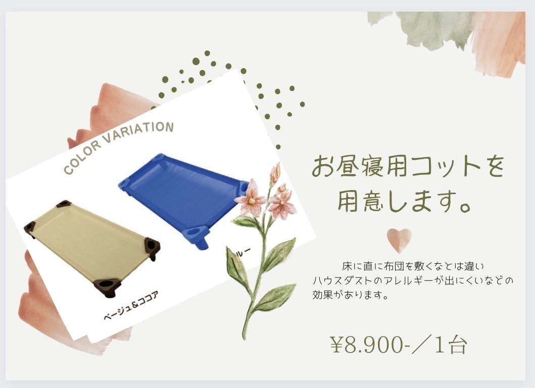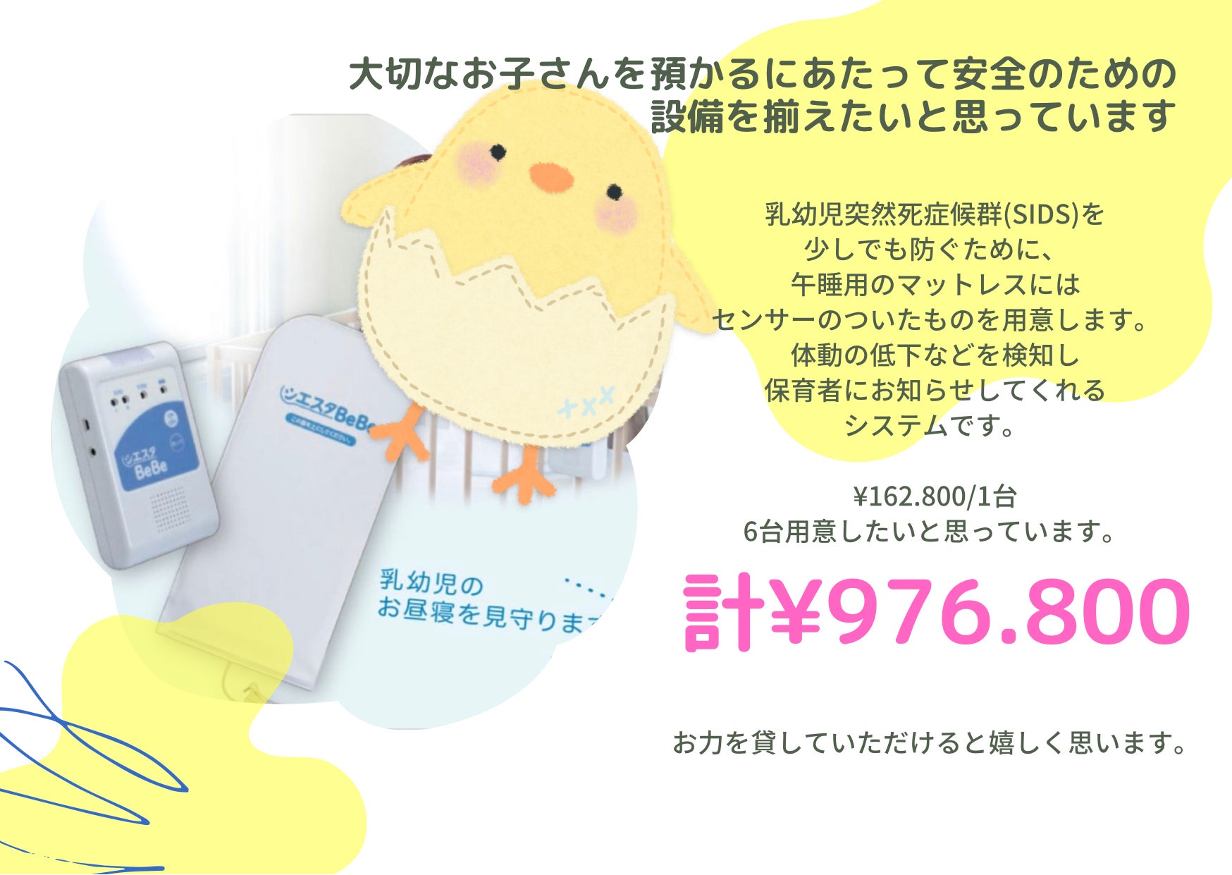 お子様を安心して安全にお預かりするために、SIDS(乳児突然死症候群)予防のために、午睡中、乳児ベビーベッドに体動感知システム