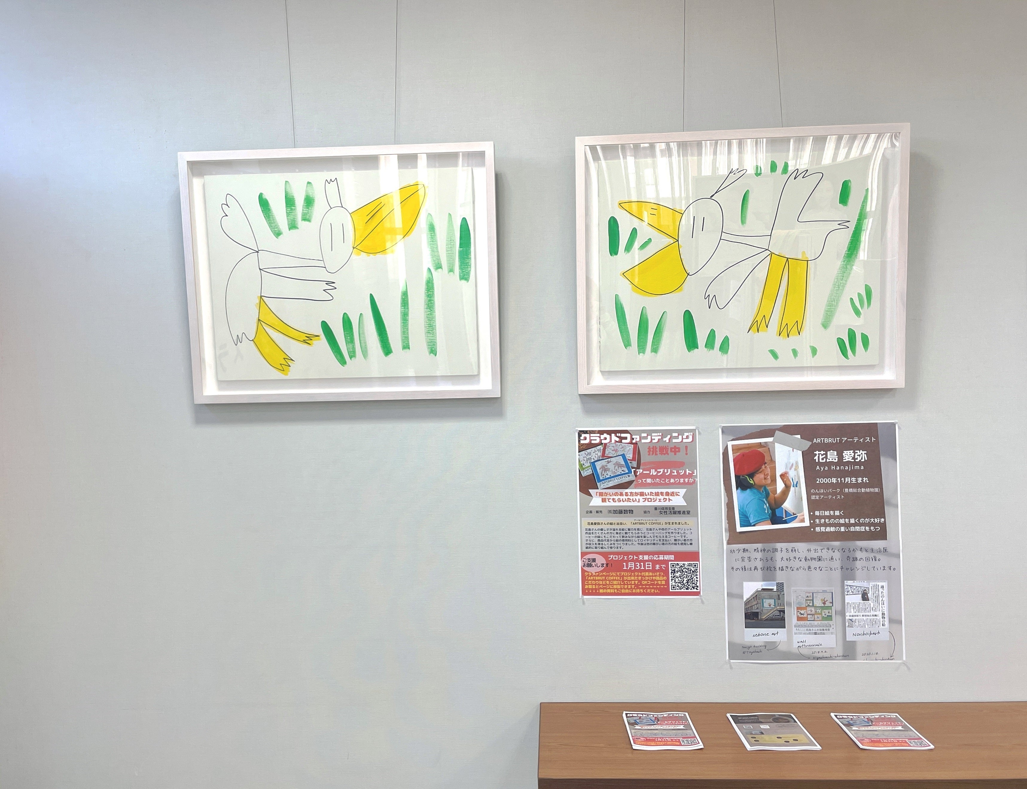 当プロジェクトについてもポスターの掲出とチラシを設置させていただきPRを実施。展示作品は今回のARTBRUT COFFEEにゆかりのある作品たちを展示しています。窓口に訪れた地元の方々に花島さんの絵に触れてもらい、ARTBRUT COFFEEについても少しでも知ってもらいたいと思います。
