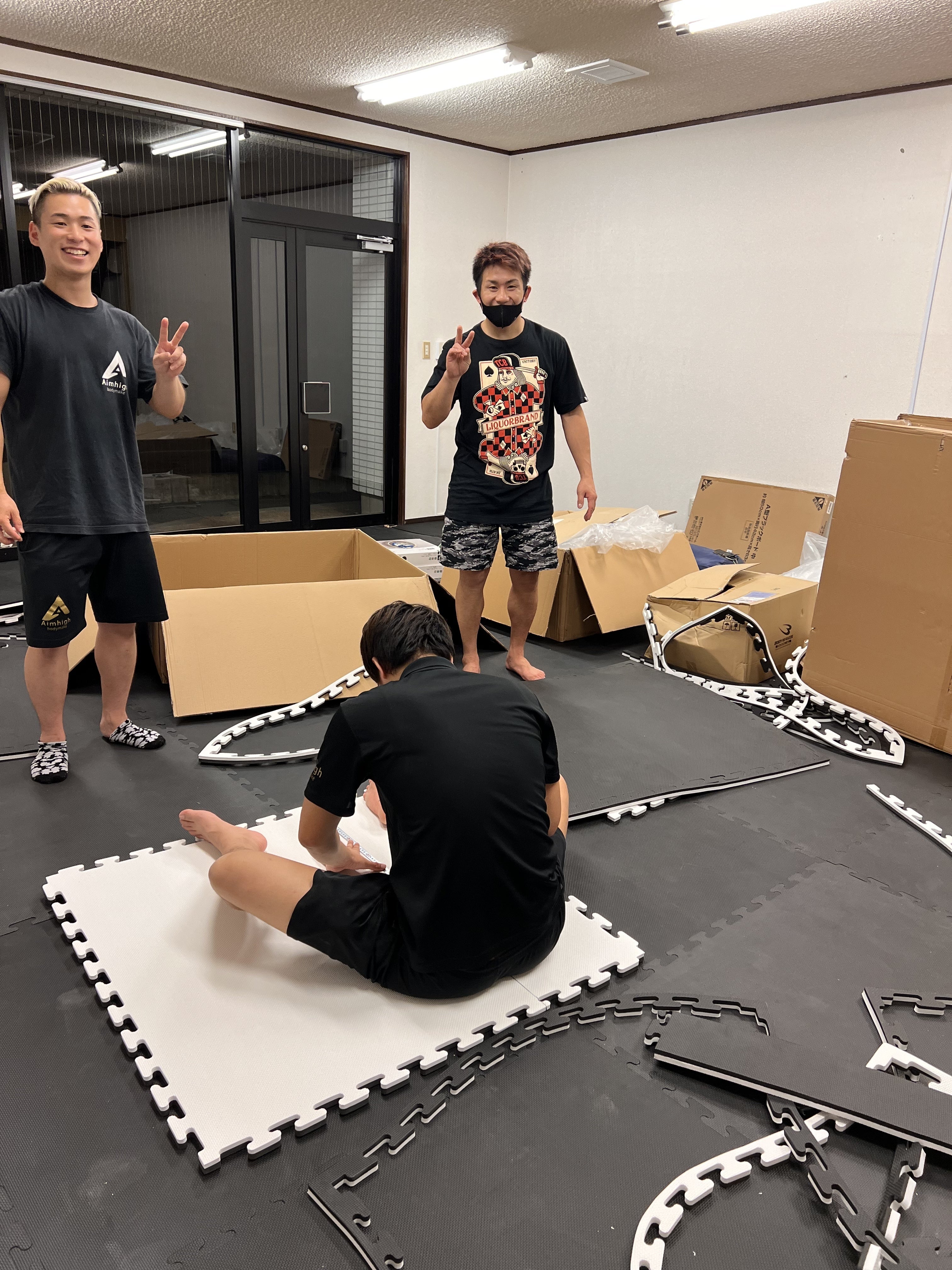 本日夜鍋してスタッフみんなで格闘技用のマットを敷いてます!これから、みんなで使うマット丁寧にカットして敷いてます。スタッフみんなで作る事でジムを愛せますね♪