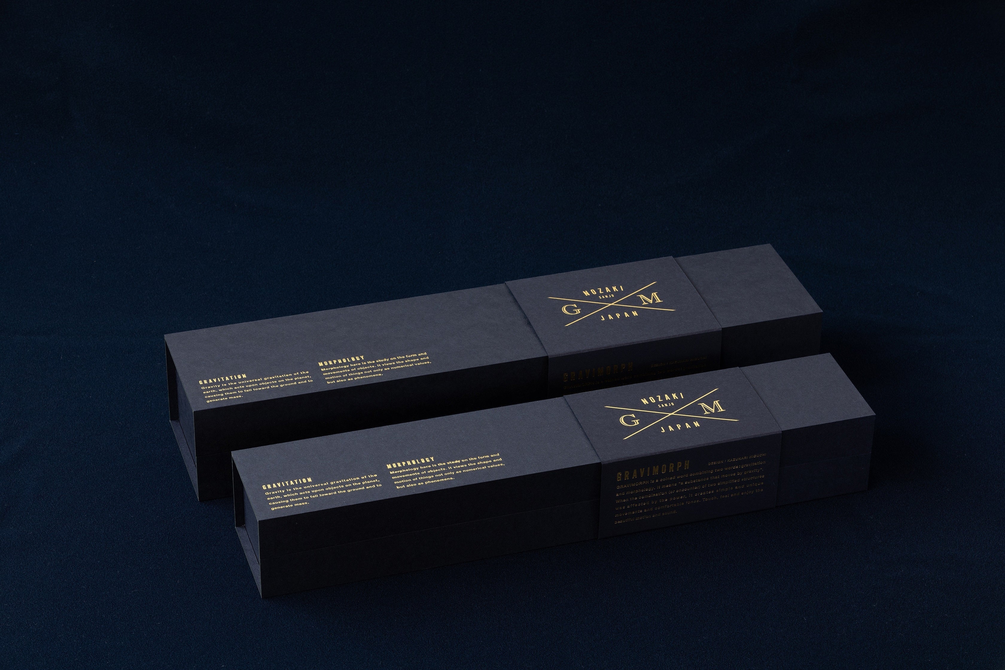 プレミアムシリーズでは、厚さ2ミリの板状の”紙”の素地(芯材)に紙を貼り合わせVカット加工という方法で仕上げた、まるで木箱のような高級感のあるGRAVIMORPH専用BOXでお届けします。