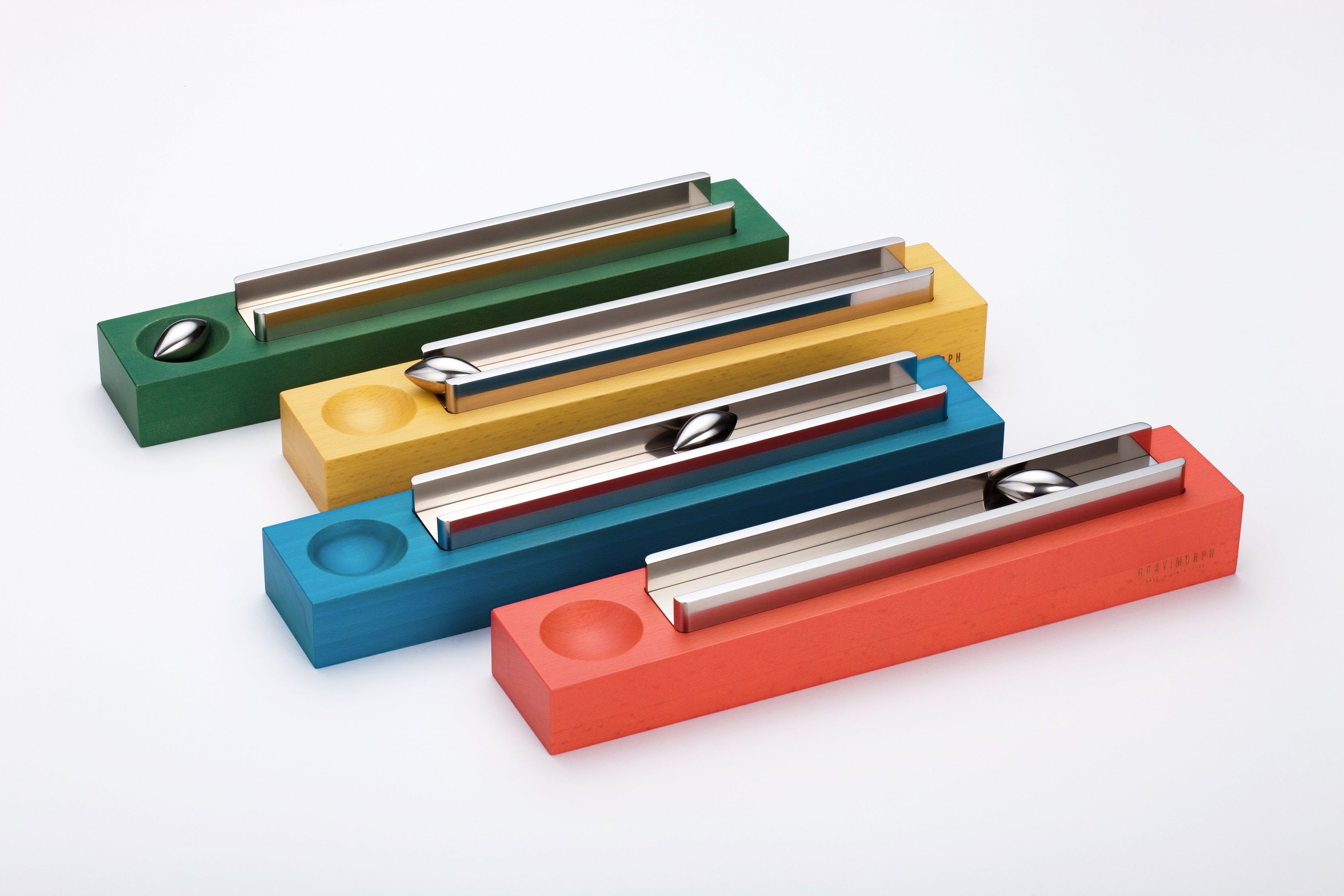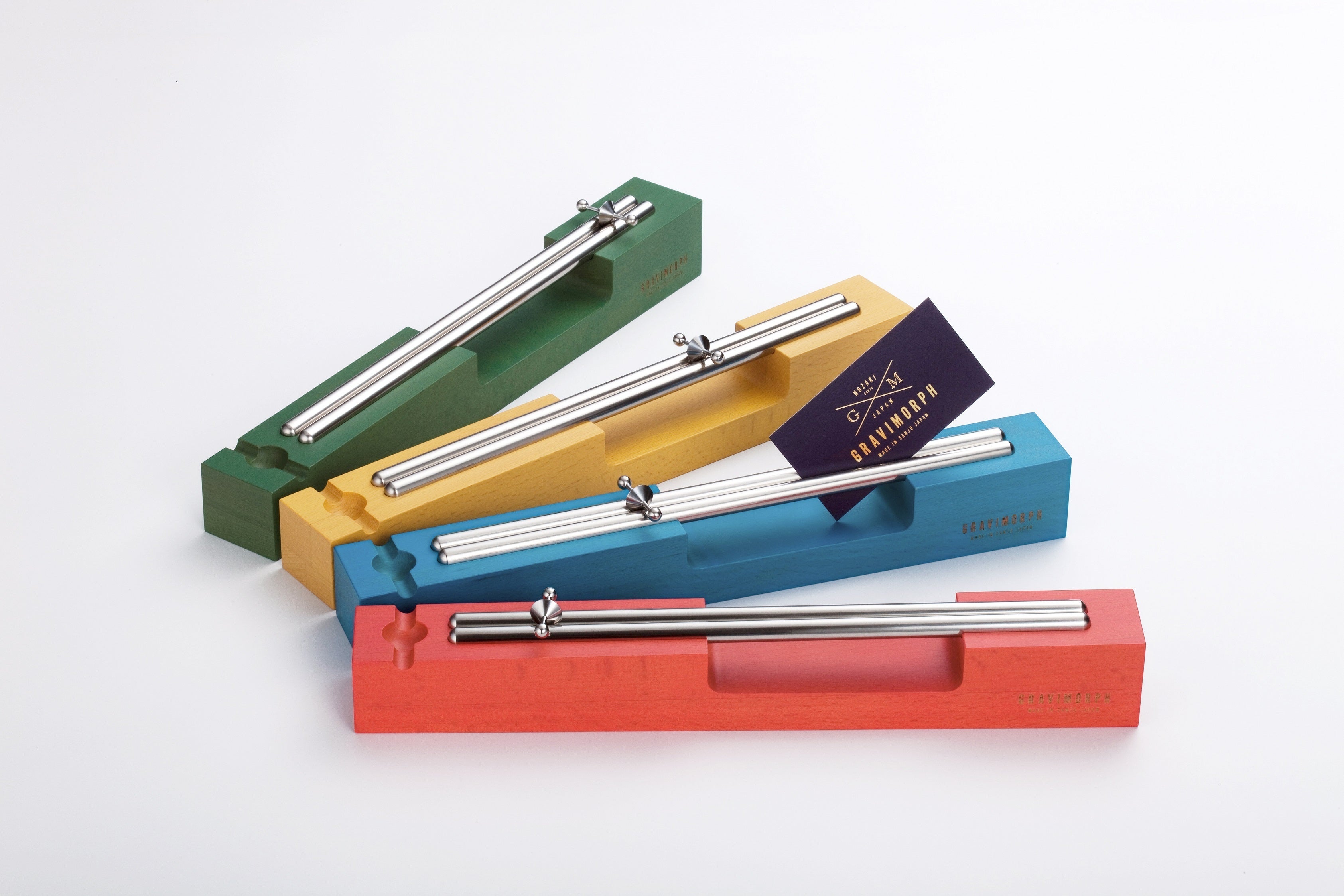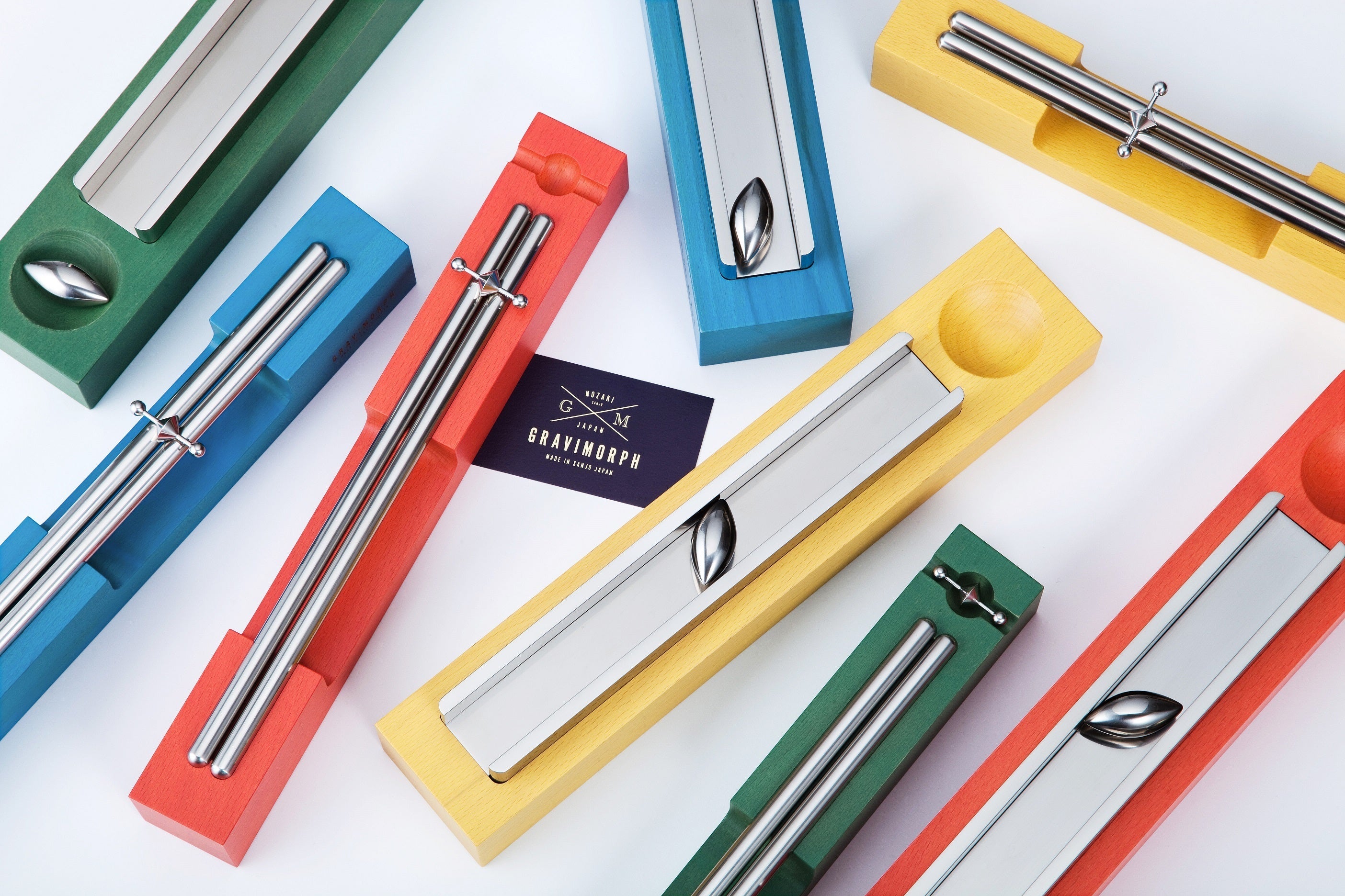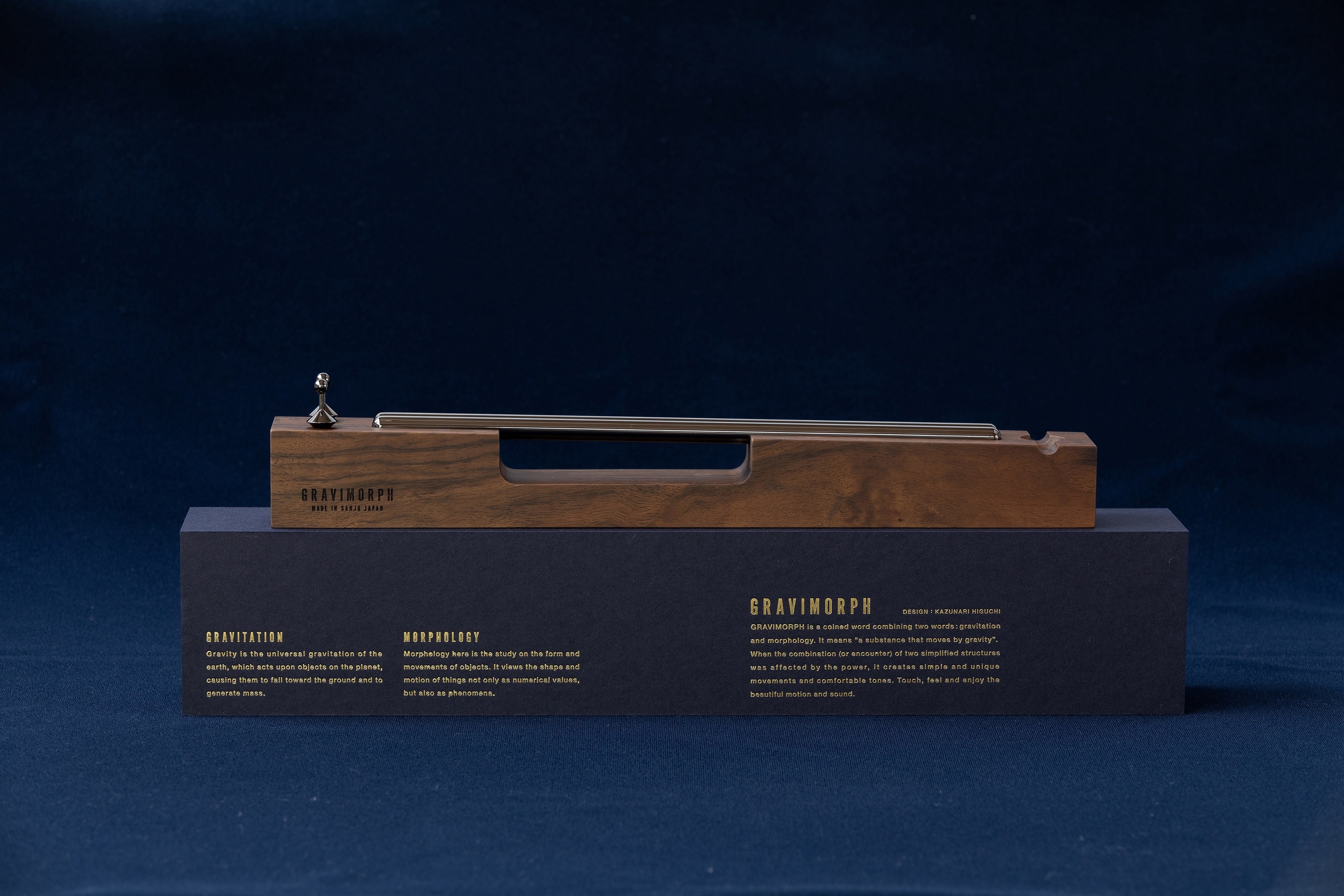 GRAVIMORPH(グラビモルフ)とは、GRAVITATION(重力)とMORPHOLOGY(形態学)という2つの言葉を合わせた造語に由来します。シンプルな形のモノとモノとの組み合わせ(出合い)が、自然の力である重力の影響を受けたとき、素朴でユニークな動きと心地よい音色を生みだします。