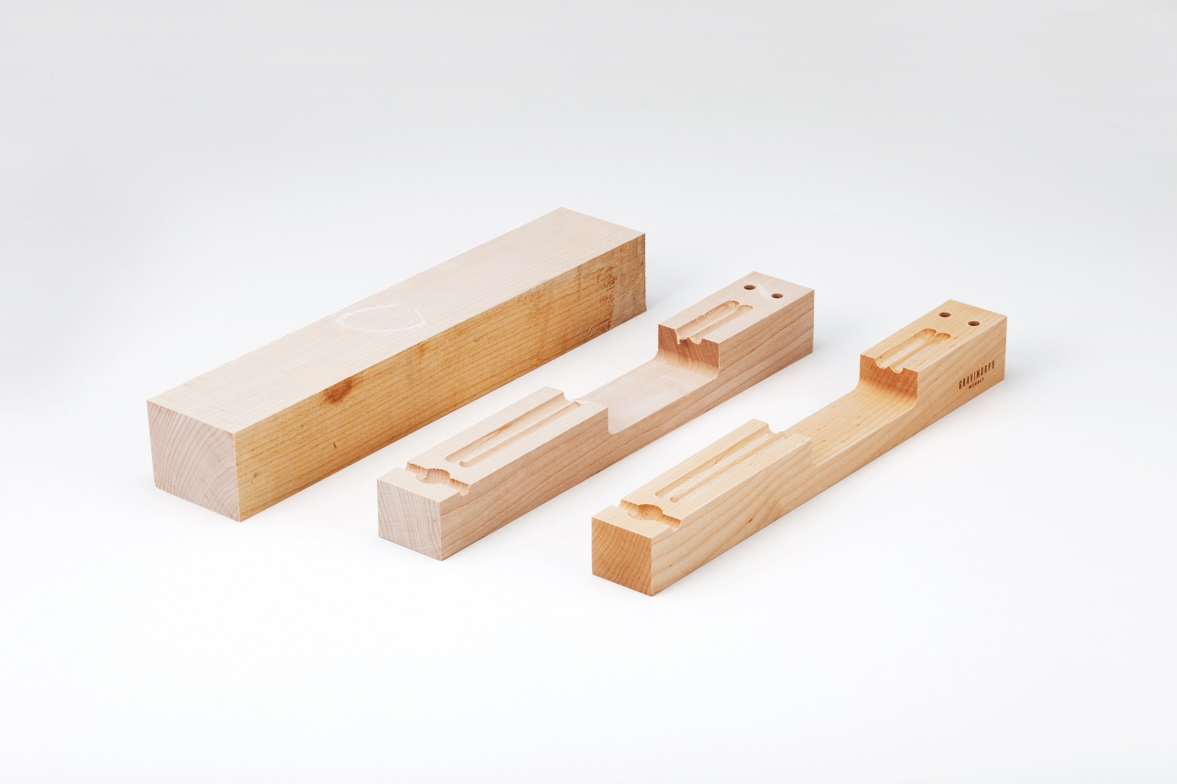 木材にはハードメープルを使用。ハードメープルも貴重な木材で、絹のような美しい光沢と真っ白で上品な木目が特徴的な木材です。グラビモルフは接着剤は一切使わず、高精度で加工された各部品がパズルのように組み合わさって成り立っています。シルバーは素材本来の美しさを楽しめる逸品です。