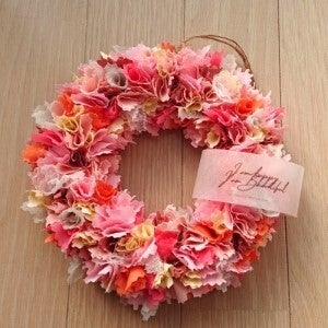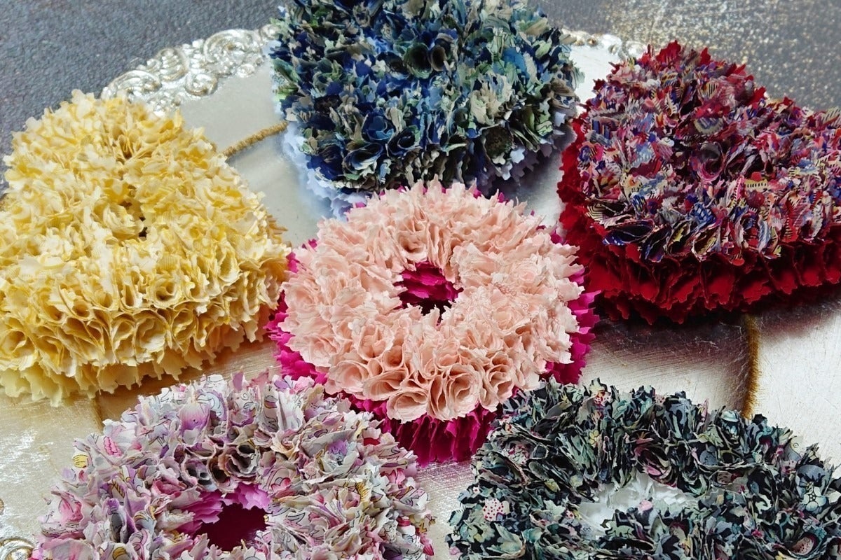 そんなとき、友人が企画するアップサイクルをテーマとしたファブリックリース作りのイベントに何気なく参加したところ、その楽しさに魅了されました。一瞬にしてファブリックリース製作に夢中になり、コンスタントに自分で作りSNSに投稿、ご好評をいただいたこともあり、最終的にはアーティストとして活動を開始することに至りました。