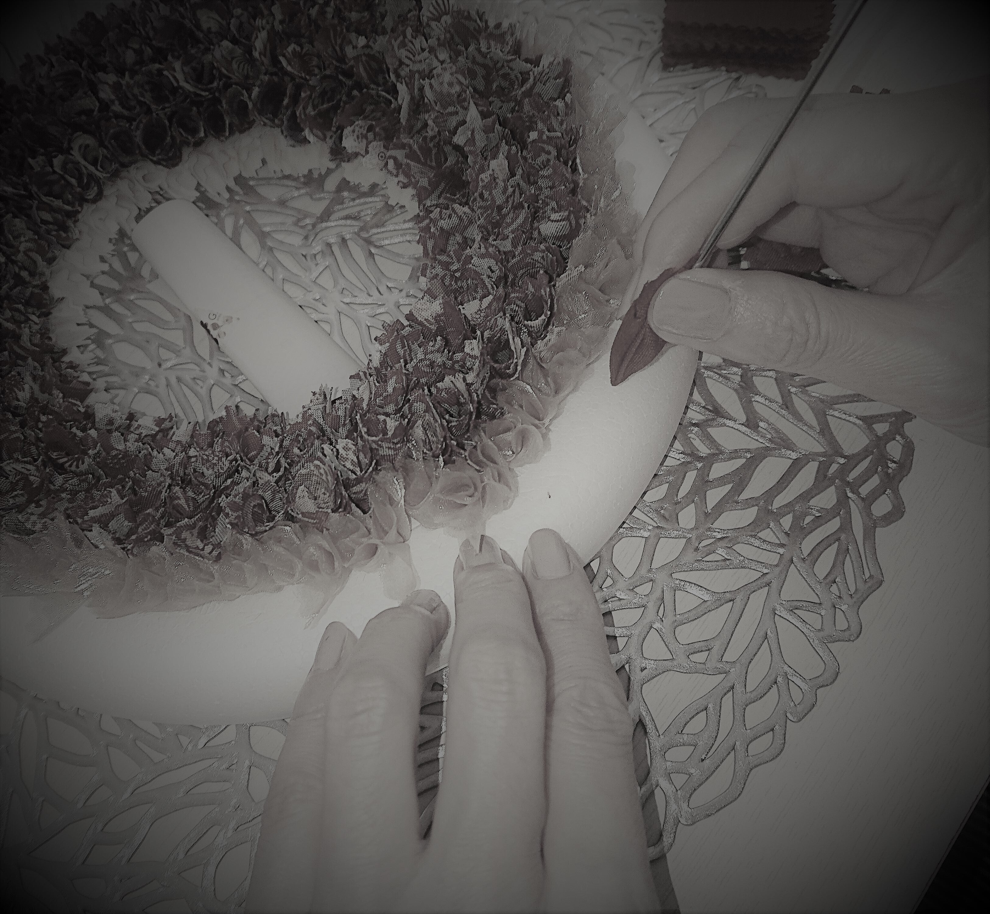 そしてピックにファブリックを巻き付け先端にボンドを塗布しベースに差していきます。巻き方、差し方は作品によって変えます。共通ポイントは放射状に差すこと。完成した時のファブリックの差し方向(毛並みみたいなもの)、リースのアウトラインの綺麗さを生み出すことが出来ます。差し方向維持のため、半分程度差したら接着剤硬化のため一晩寝かせます。残り半分は翌日に差します。