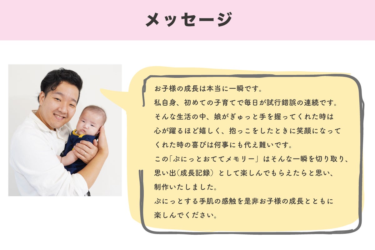 私事ですが今年の7月に第一子が産まれました。日々成長していく我が子の成長スピードに驚くと共に、”この一瞬を残したい”と感じることがたくさんあります。今回の手形・足形の感触はその一つです。1人でも多く私と同じように感じているママ・パパに届けば嬉しく思います。