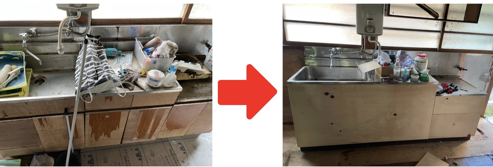 前にゴシゴシ磨いたキッチンのシンクの扉を外し板を張ってもらいました!