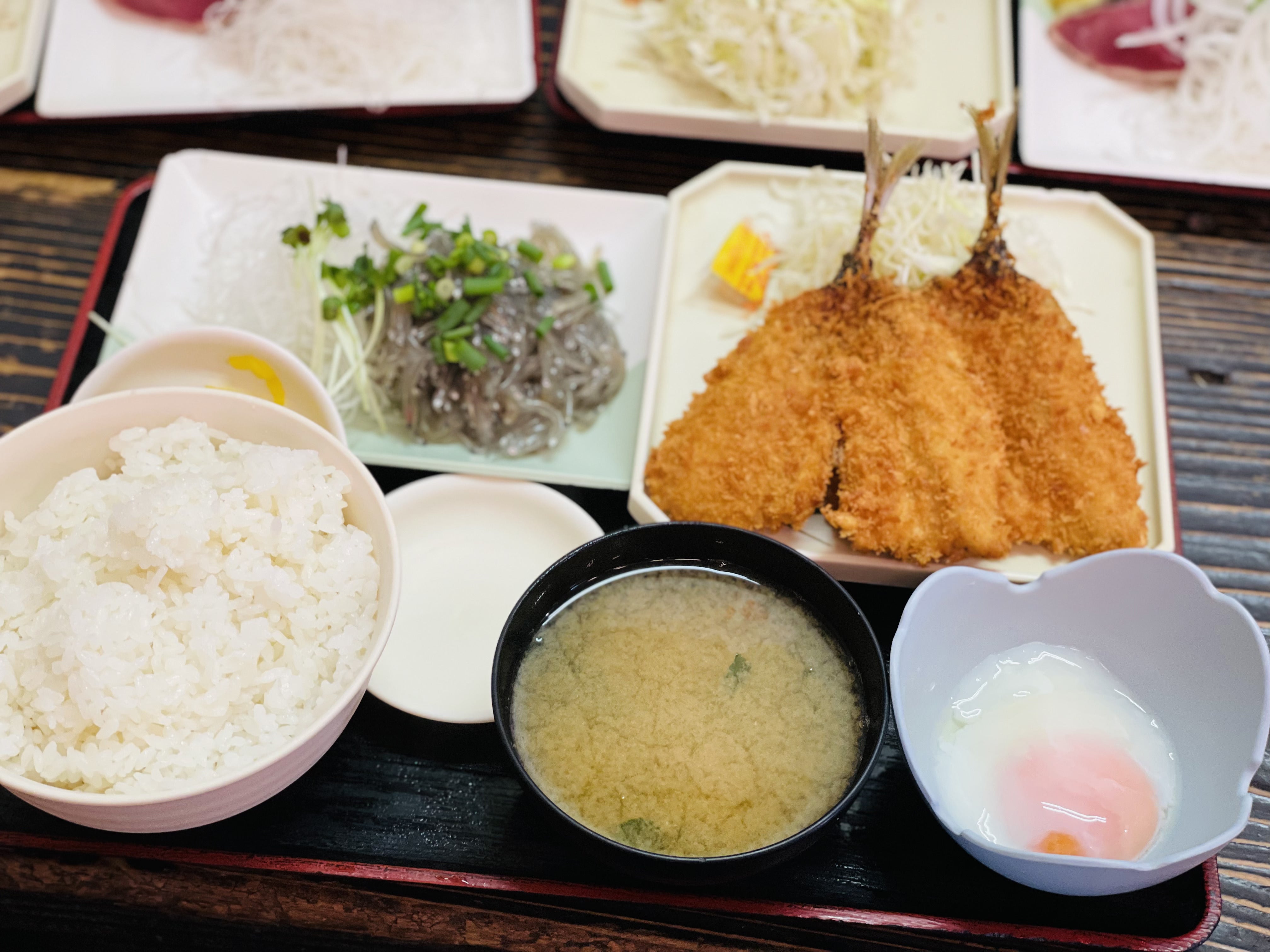アジフライの定食に刺身1品(生しらす)のトッピング。