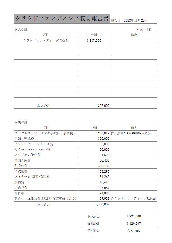 2023/11/25 09:00いつもスタスレビューを応援してくださり本当にありがとうございます!!!大変遅くなってしまい申し訳ございません。この度のクラウドファンディングの収支ご報告させていただきます。改めまして、ご支援くださいました皆様に心から感謝申し上げます。これからもスタスレビューの応援何卒よろしくお願い致します。上記内容に関しては、スタスからの報告を基に作成したものです。詳細、ご質問、ご意見などございましたらお手数をおかけしますが、直接スタスにお問い合わせくださいますようお願い申し上げます。有限会社スタス 電話:03-5828-3891(FAX共通)メール:skd-og-stas@j-bolero.comこちらのご報告をもちまして、クラウドファンディングの任務完了とさせていただきたいと思います。初めてのことだらけで至らぬ点も多々あったかと思います。本当にこれで大丈夫なのかと毎日不安な日々を送っておりました。試行錯誤しながら連日こまめにクラファンチームで連絡を取り合い、他のメンバーにも拡散など色々協力してもらい、そして何より皆様のおかげで無事に達成することが出来ました。沢山のことを学び、感じ、勉強させていただいた半年間でした。支援者様からの温かい応援コメントにも、いつも勇気をいただいておりました。本当に、本当にありがとうございました。 もっと見る