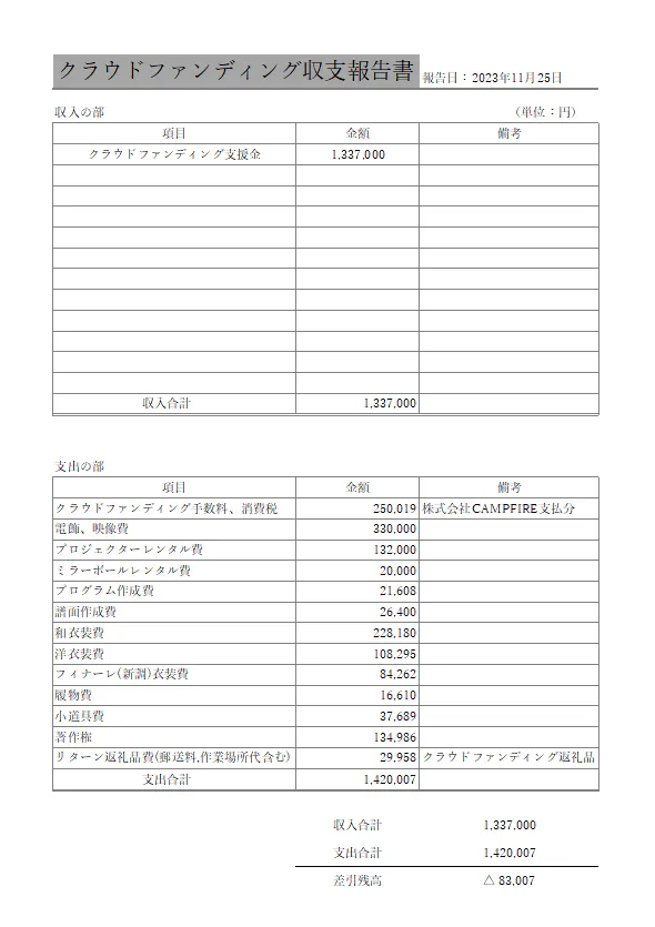 クラウドファンディング収支報告