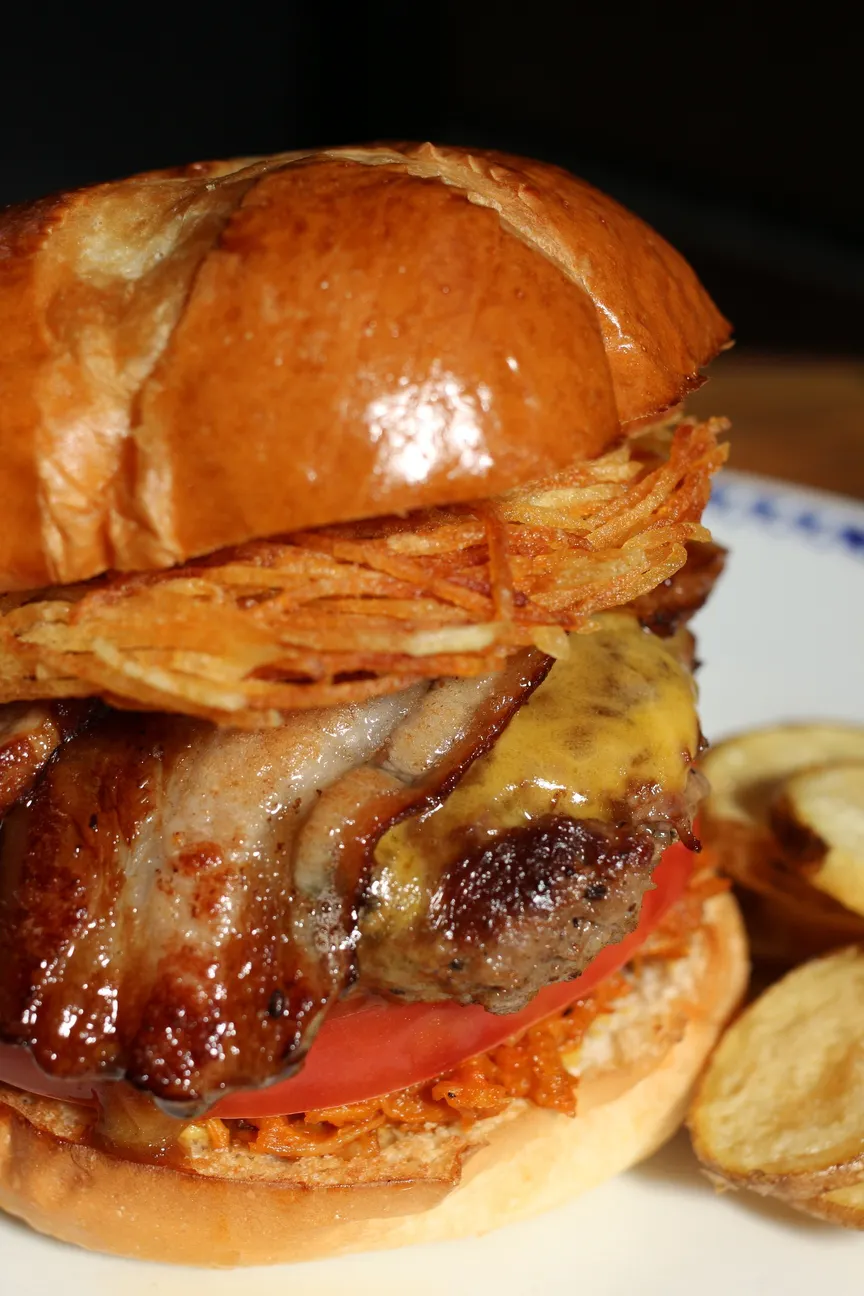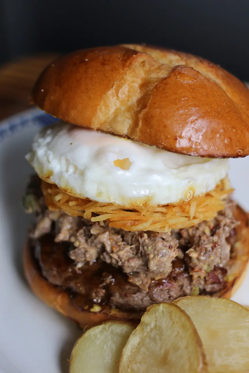 間に挟まれたじゃが芋ガレットのざくざく食感が心地いいハンバーガーに仕上がっています。