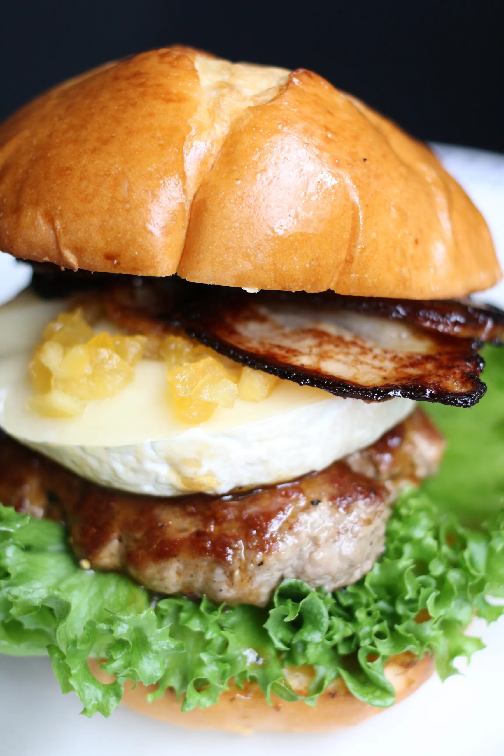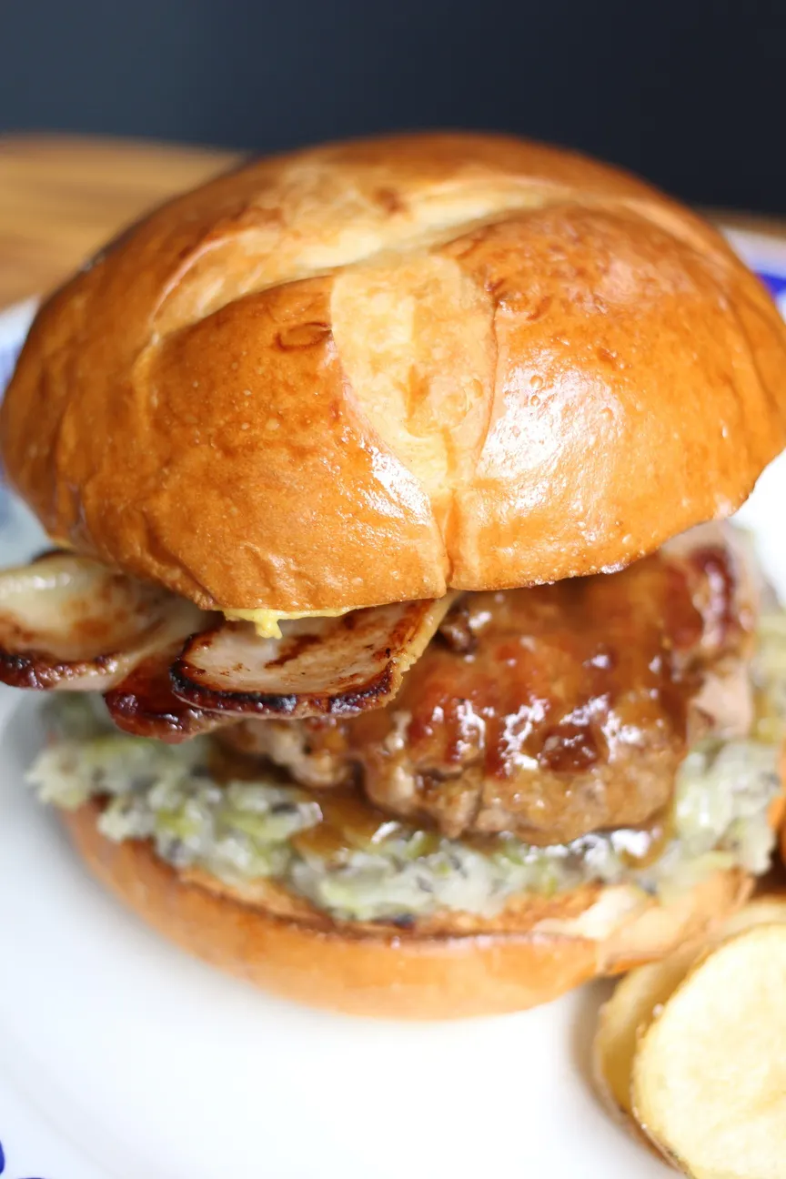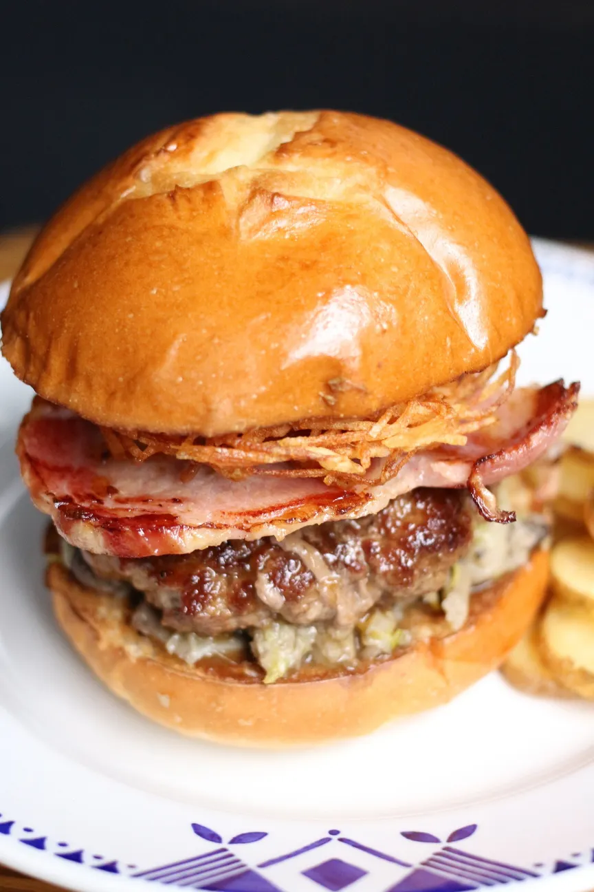 カマンベールチーズと自家製味噌ベーコンにりんごのコンポート、ローズマリーバターであっさりとしていながら薫り高いハンバーガーに仕上がっています