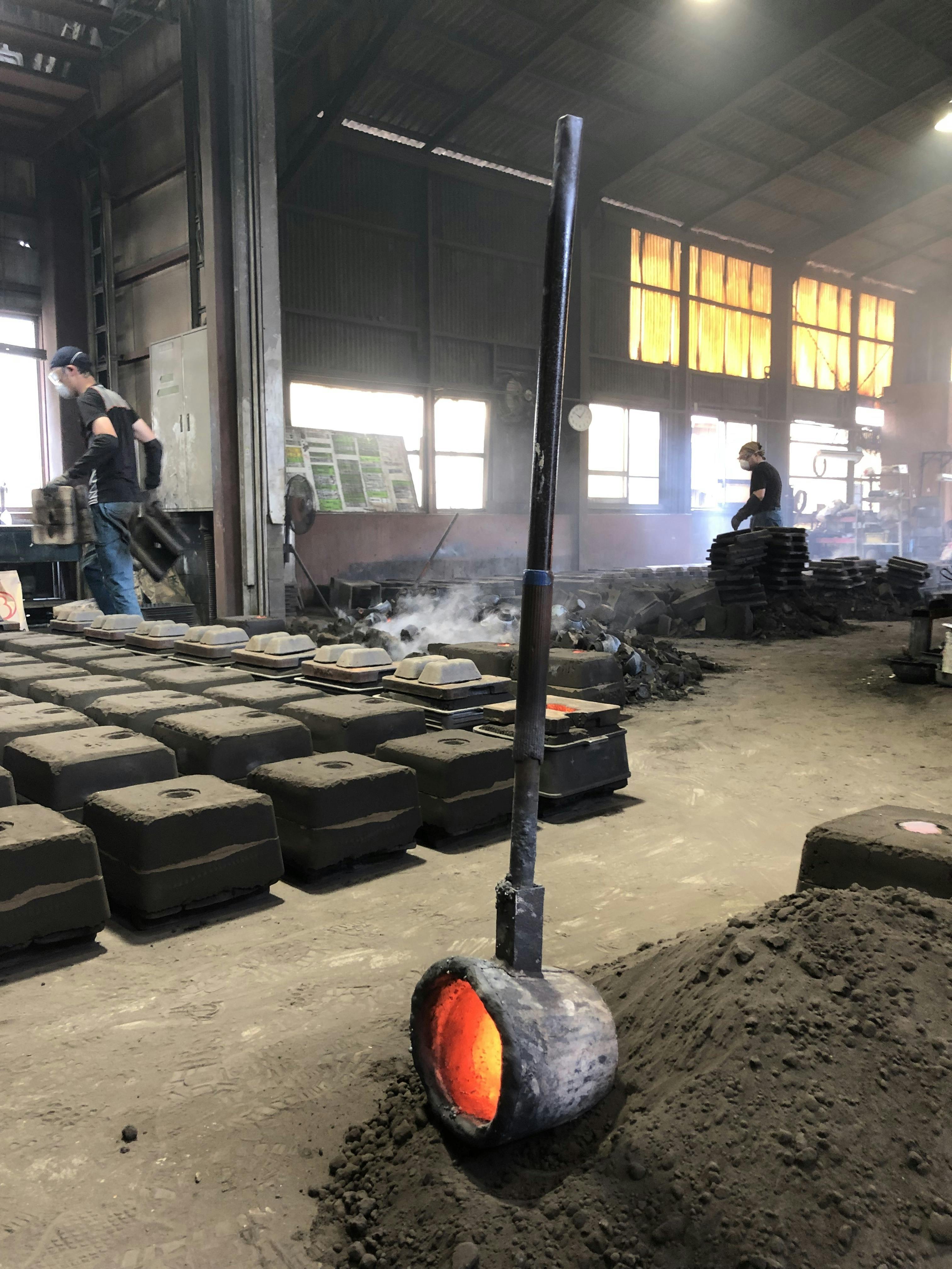 南部鉄器製造工房(溶かした鉄を、北上川の砂と、粘土で作った型に流し込みます)