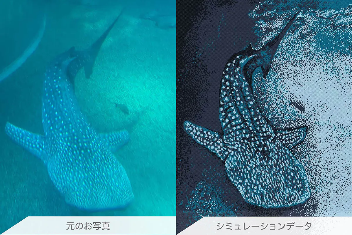 編み機専用のCADコンピューターを使って、無限の色数で表現されている写真を限られた数色でまとめつつ元の写真に近づけた柄に再現するのがジャカードニット編地です。