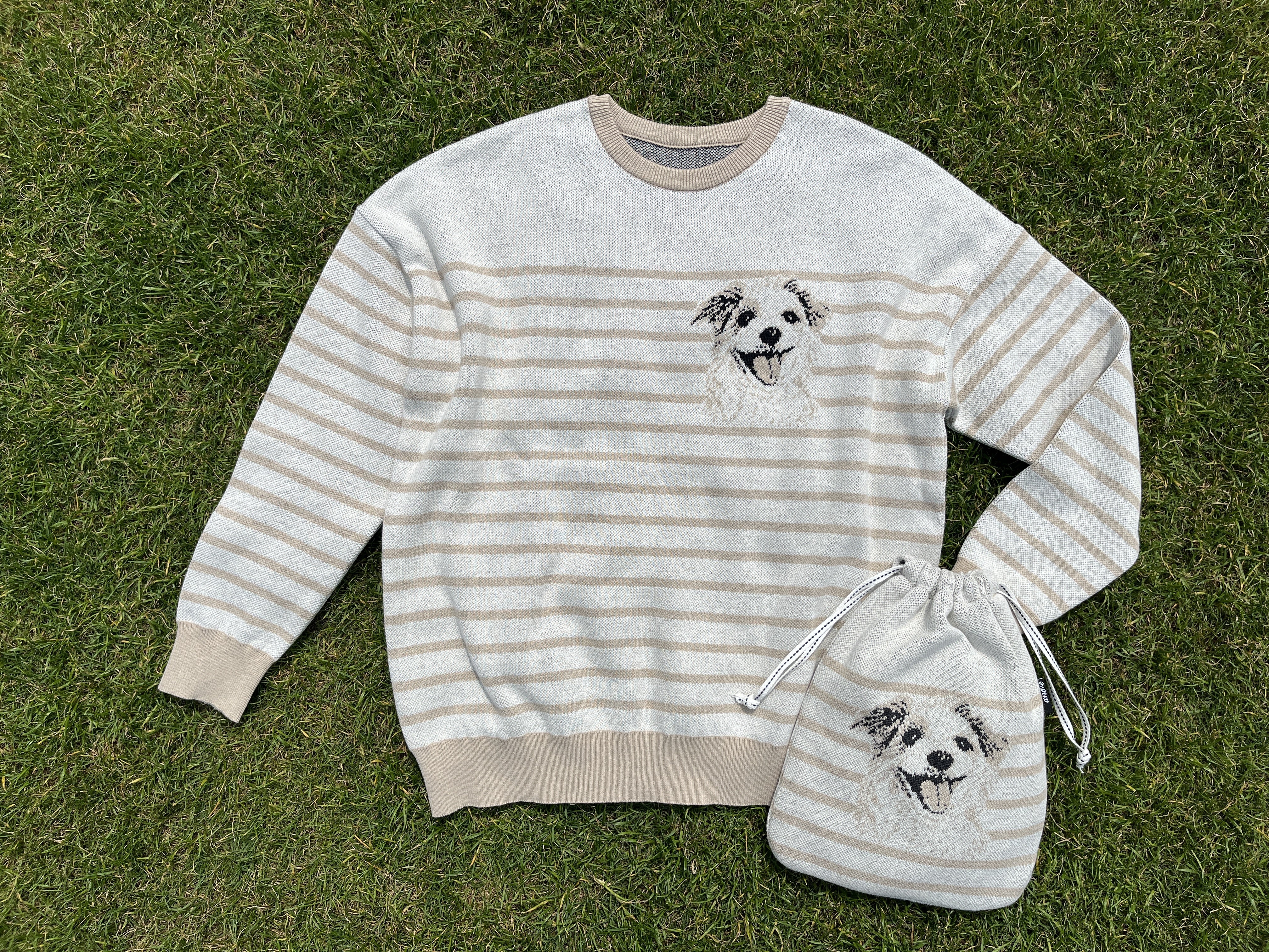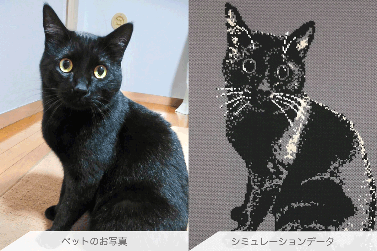 SNSなどを介してお預かりしたお写真から、被写体そっくりのCGデータを作り上げて、一般的に洋服を作る工業ニット自動編機を駆使してジャカード編みでCGデータ通りに編み上げ、お好みのお品に仕立ててお届けしています。