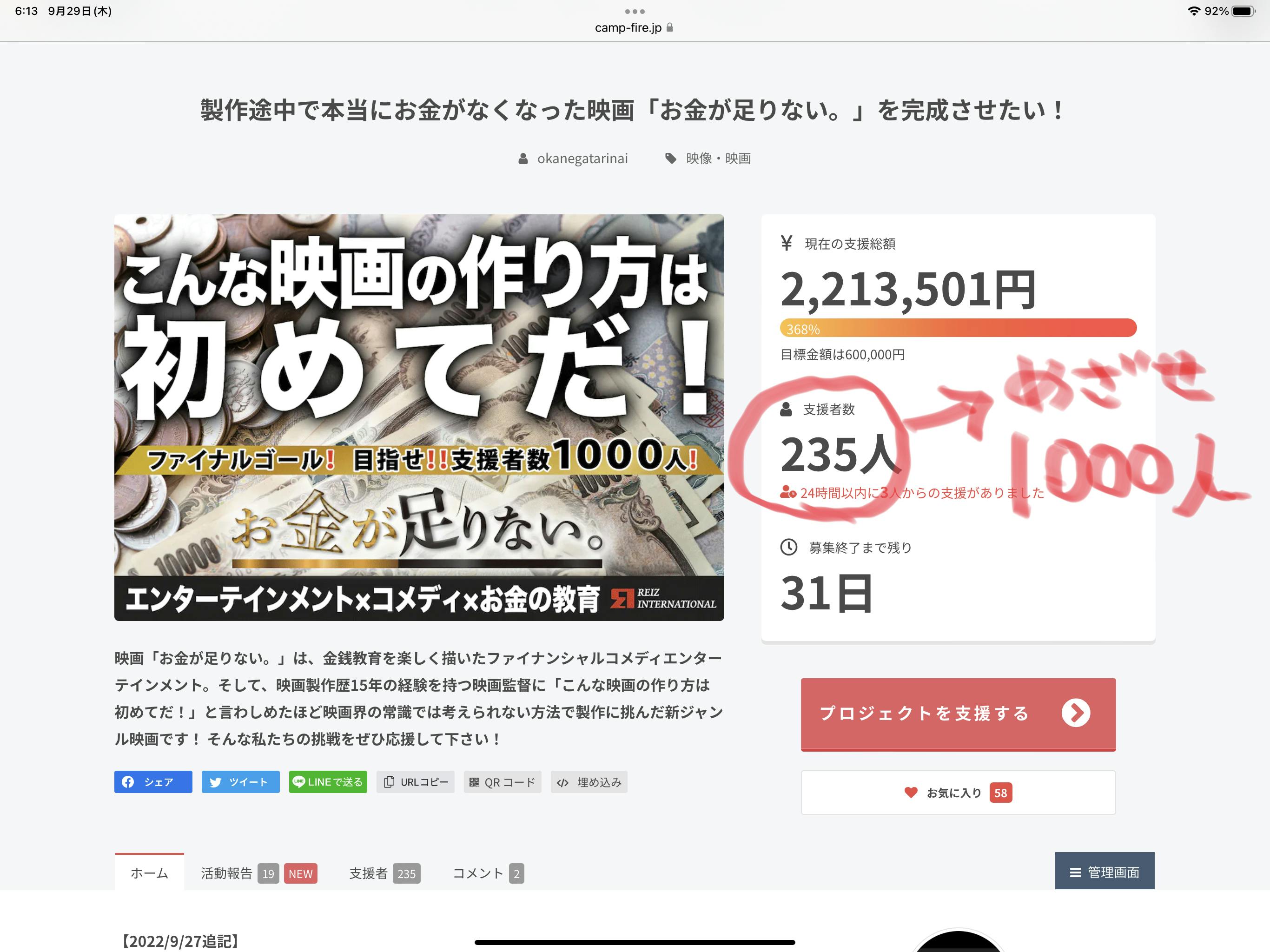 目指せ! 支援者1000名!!