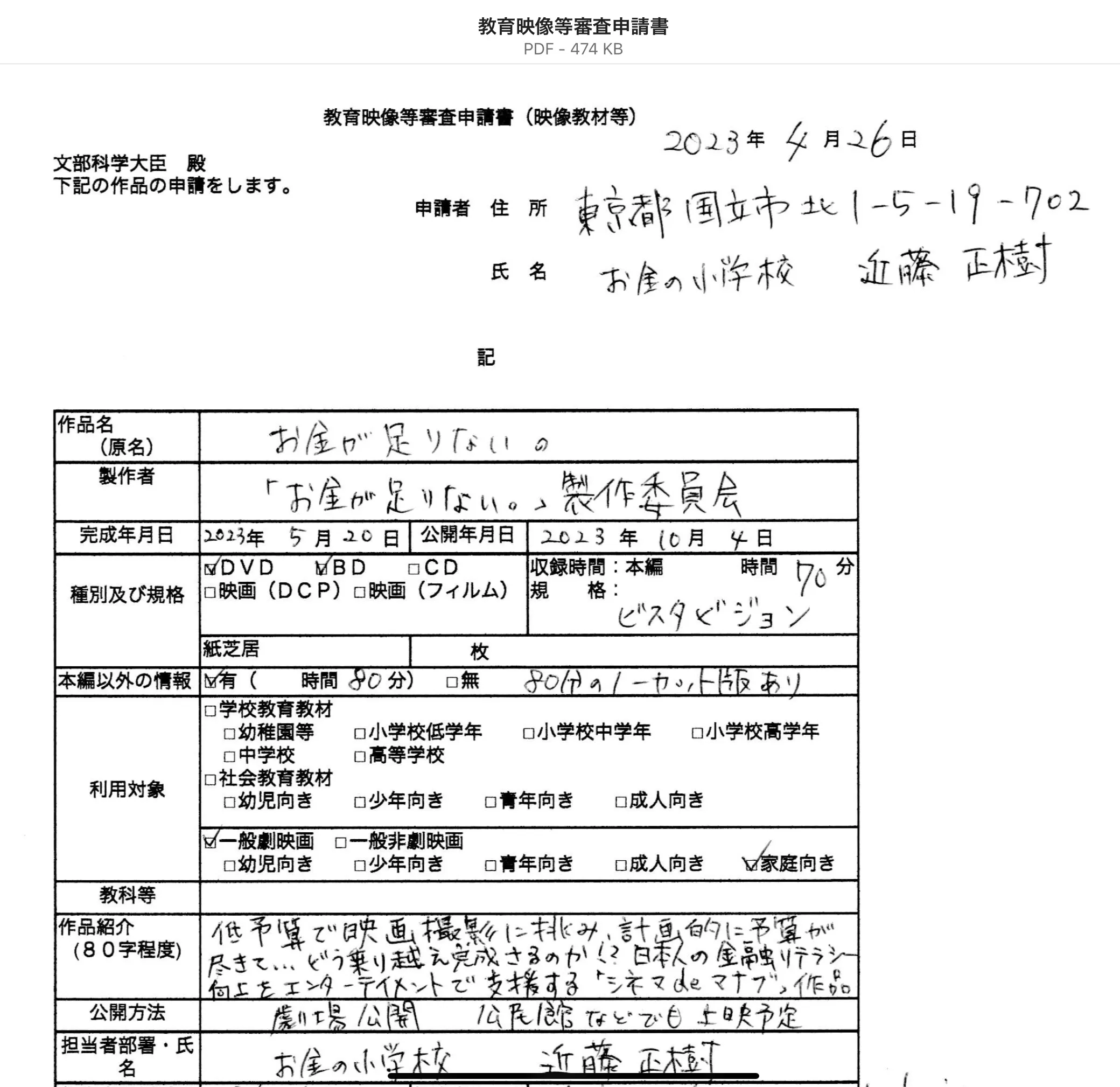 先日、文部科学省の推薦映画に申請しました!!!