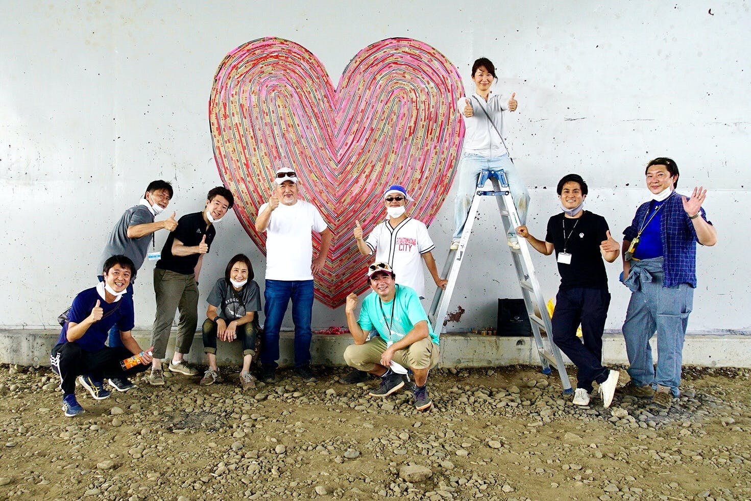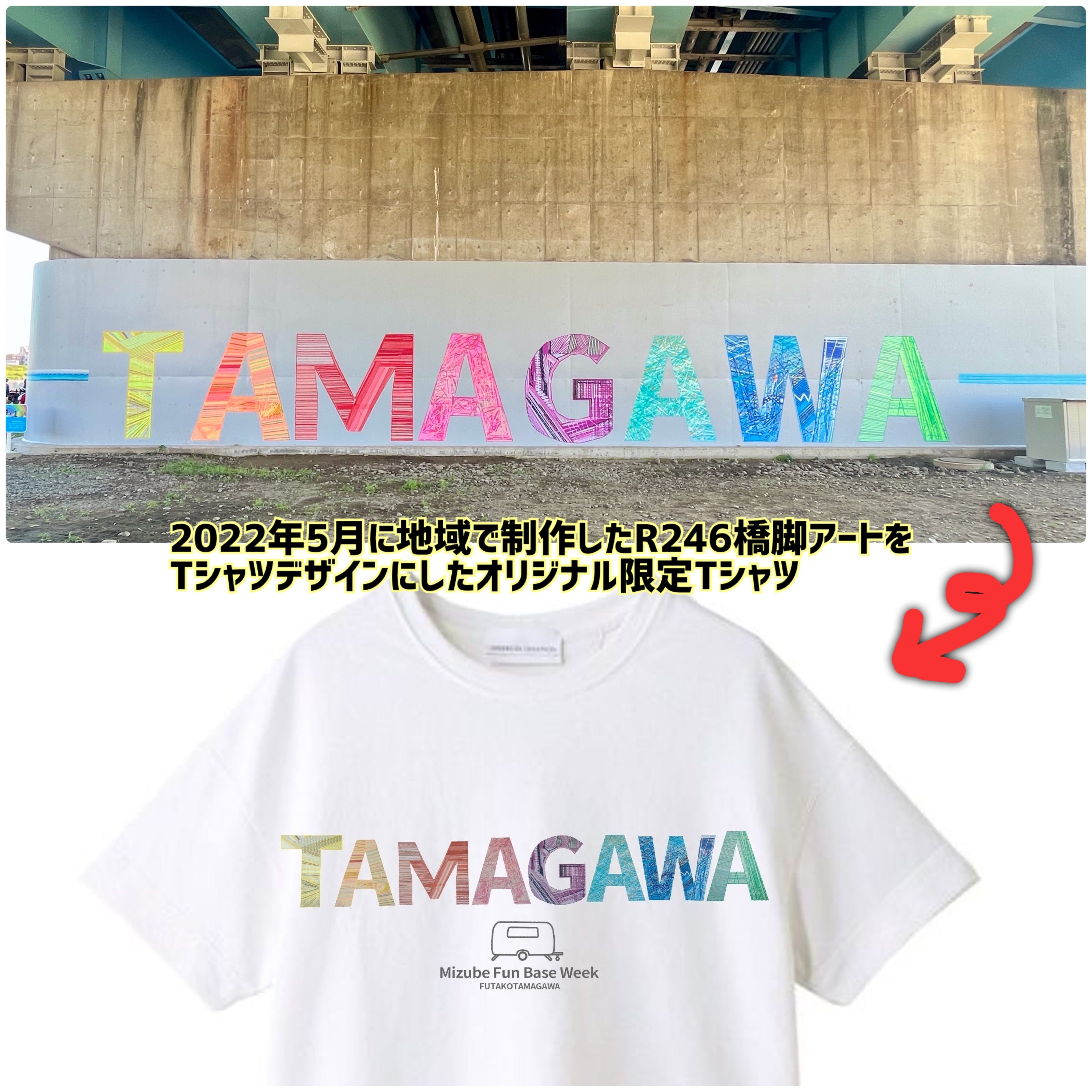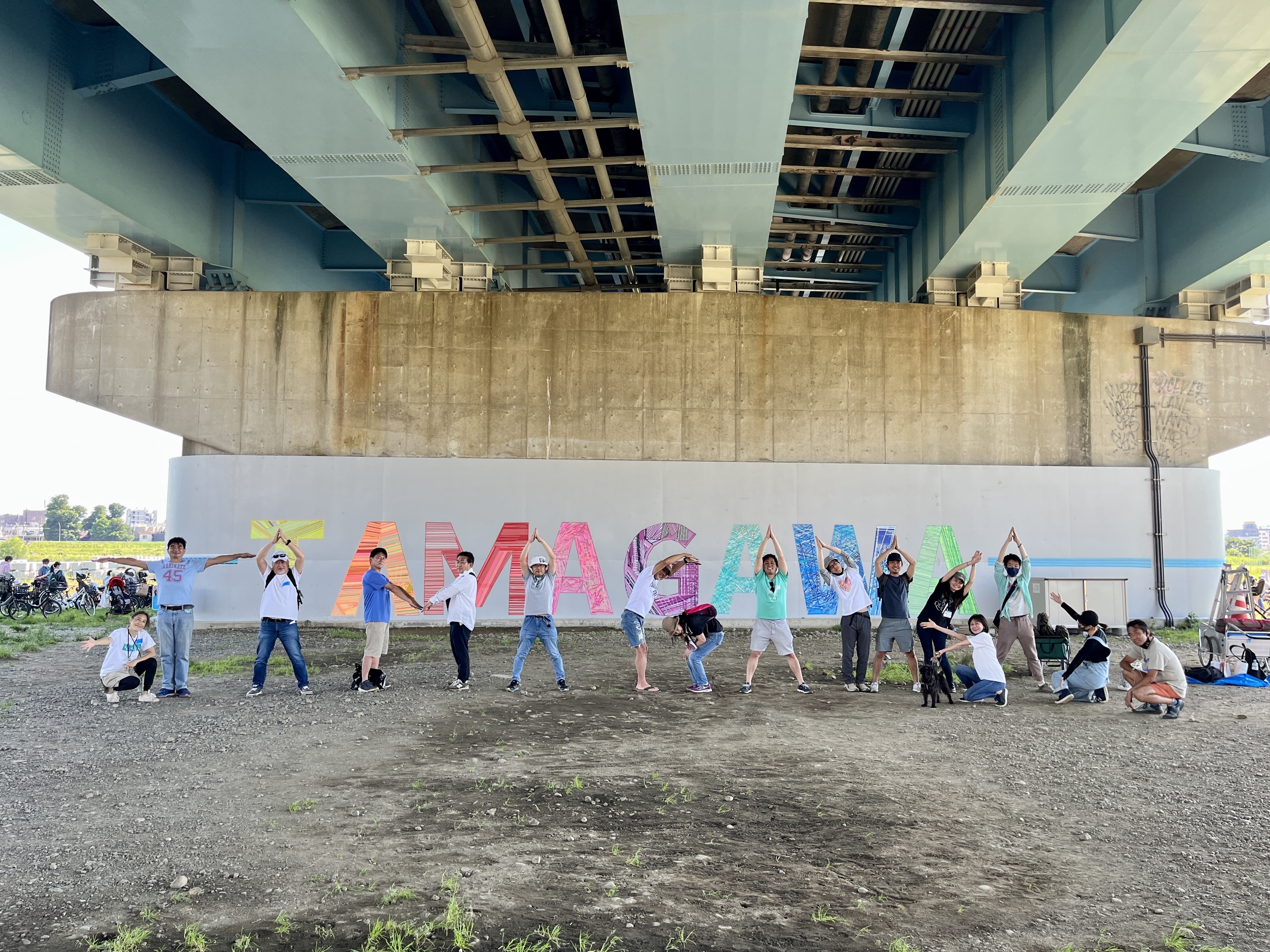 地域の皆さまと一緒に描いた国道246号橋脚壁画アートの前で「TAMAGAWA」ポーズ! 実は、この河川敷のひろばを日常的につかうには、他にもいろいろな課題があります。