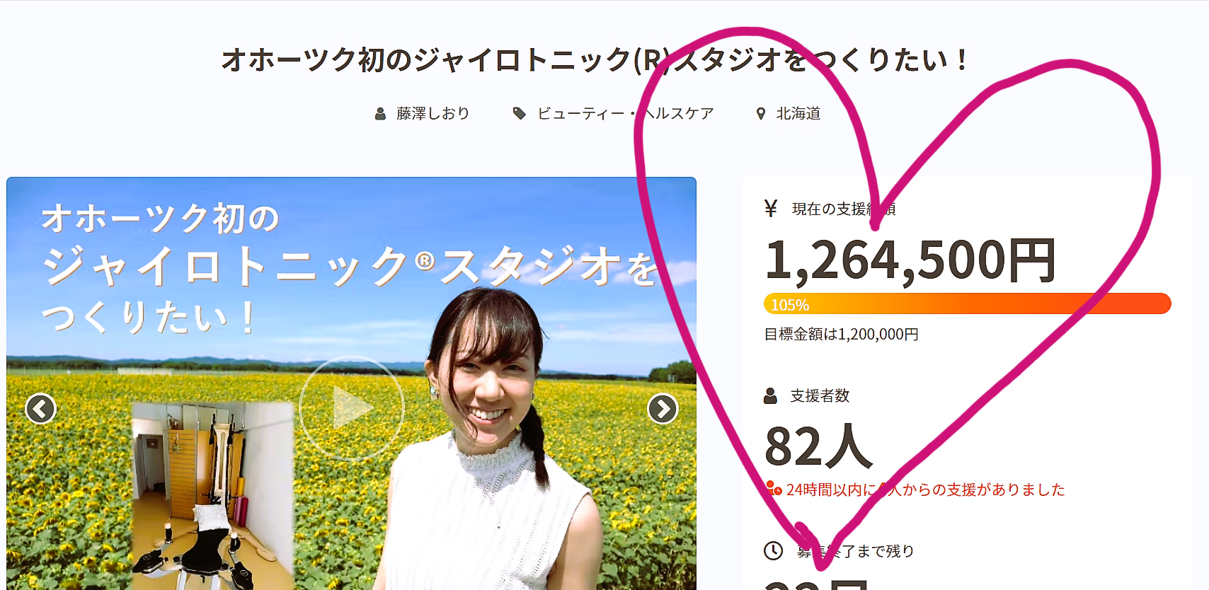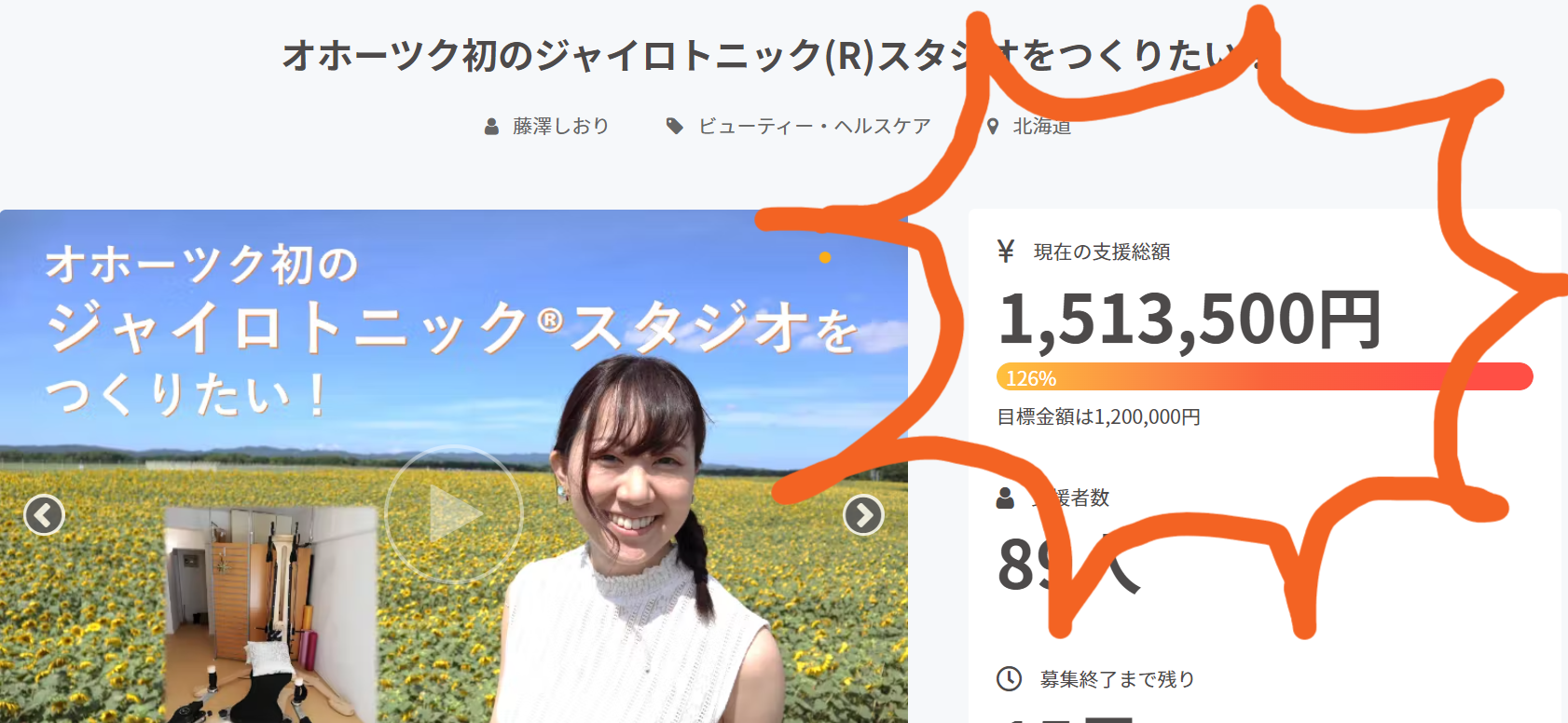 「オホーツク初のジャイロトニック®スタジオをつくろう!」プロジェクトオーナーの藤澤しおりです昨日、プロジェクト11日目になんと目標額120万を達成いたしました!!!!ご支援くださった皆さま、本当に本当にありがとうございます!!現在82名の方に応援いただいています。 まさかこんなに多くの方に支援いただけるとは思ってもいませんでした。すごいことです。ぼんやりと夢だった自分のスタジオを地元に持つこと。大好きなジャイロトニック®をオホーツクエリアに初めて導入できること!夢じゃない、このわくわくを噛みしめています。長年お世話になっている、大好きなジャイロトニック®トレーナーの先輩に目標達成のお祝いメッセージをいただき、「クラウドファンディングは信用の可視化だよ」と言っていただきました。この言葉はわたしにとって最大級に嬉しく、ちょっと泣きました。10年前に理学療法士になったばかりの頃の自分は、今思えば生意気で常識知らずで、自己中心的な人間だったと思います。そのせいで友人や仲間や先輩に心配をかけたり、失望させたりしたこともあると思っています。あの頃は本当にすみませんでした。それからしばらくして、信用信頼を積み重ねていこうと思う出来事がありました。この度クラウドファンディングを通して嬉しいのは、今現在のわたしを知っている方だけなく、昔の未熟な頃のわたしを知っている方たちのお名前もたくさん拝見できたことです。本当に嬉しいことです。昔の上司に「恩返しは、これから出会う人たちにしてやるんだよ」と言われました。大事にすることを間違えないように、精一杯、想いを上乗せしてみなさまに返していきたいと思っています。たくさんのジャイロトニック®トレーナーさん、理学療法士の仲間からの応援もとっても嬉しいです!わたしは胸を張って、大きな声で「理学療法って役に立つんだよ!!ジャイロトニック®メソッドって素晴らしい!!」と言います!みんなで伝えていけたらいいなと思っています。あまりにも嬉しすぎて、自分語りを失礼しました。実はまだ期限が22日残っており、ネクストゴールについても検討しています!!!引き続き、パワーを送っていただけると嬉しいです。よろしくお願いします!藤澤しおり