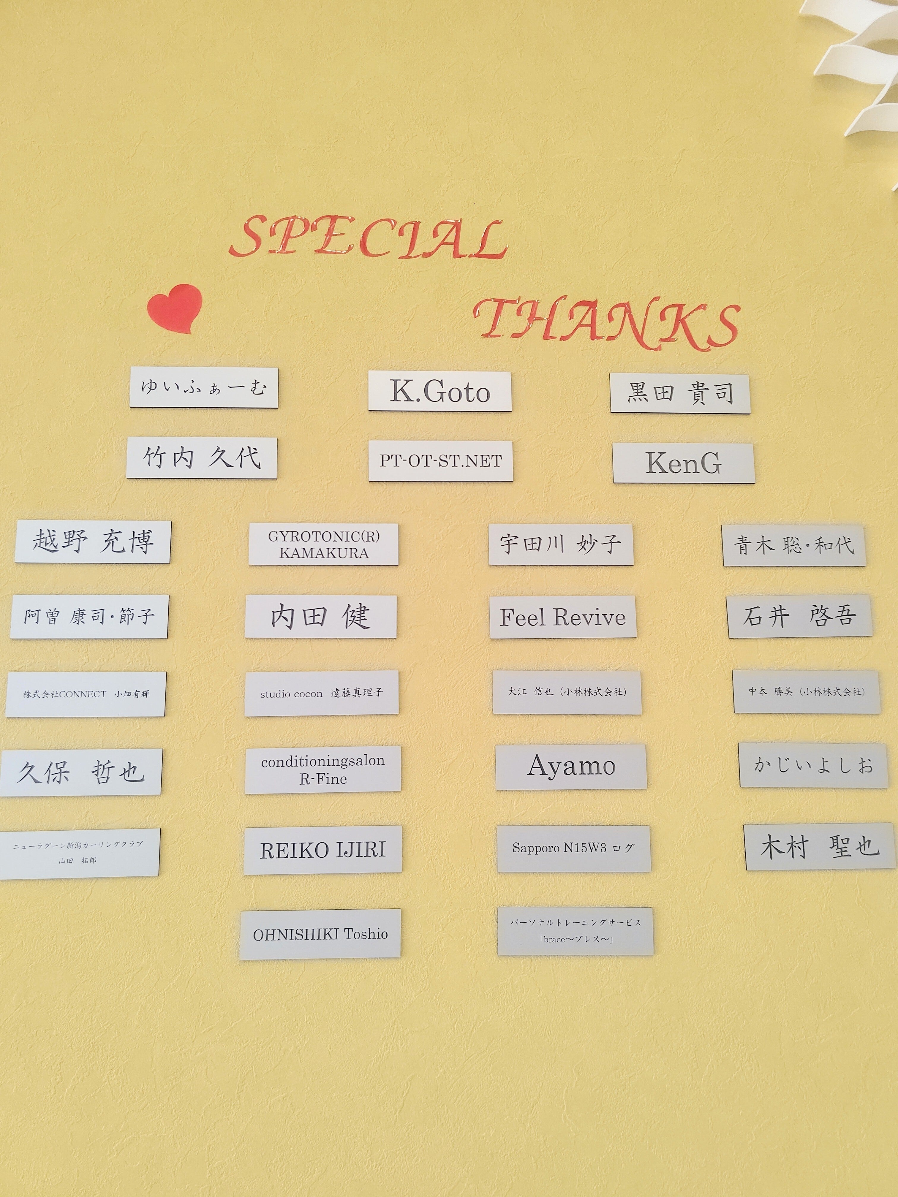 「オホーツク初のジャイロトニック®スタジオをつくりたい!」ご支援いただきまして本当にありがとうございました!リターンの一つである"スタジオ内にあなたのお名前載ります!" 大変遅ればせながら、ようやく完成致しました☆こんな感じになりました!格好良いです!お気に入りの壁になりました。そして当初は期間限定掲載の予定でしたが、永久保存にしたいと思います!(都合悪い方おりましたらご連絡ください)このサインを見ながら、改めてみなさんの応援の想いを感じています。 ここオホーツクに、ジャイロトニック®スタジオがあること。皆さんの心地よい生活のお手伝いができるように頑張っていきます。ぜひスタジオにいらしてもらって生でも見てほしいです☻そしてセッションリターンは4月末までとなっておりますのでお急ぎください!リターンクーポンてご予約出来ない際はお手数ですがご連絡ください、お手続きさせて頂きます。あなたのお越しをお待ちしております✾