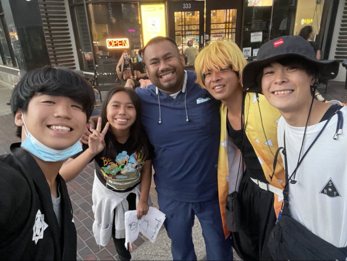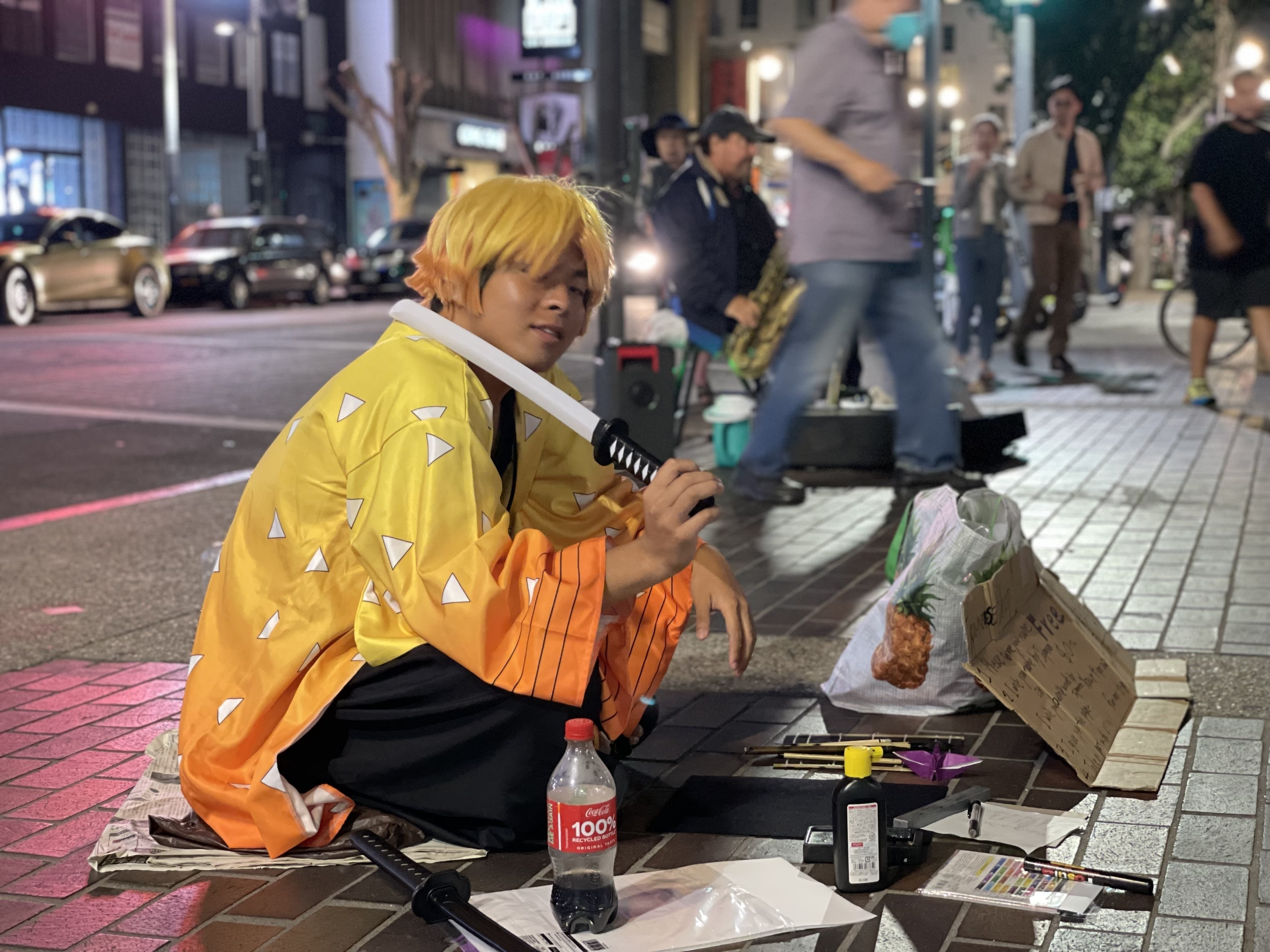 路上パフォーマンスでは、侍と鬼滅の刃のコスプレをして、折り紙や、習字をして日本の文化を伝えております