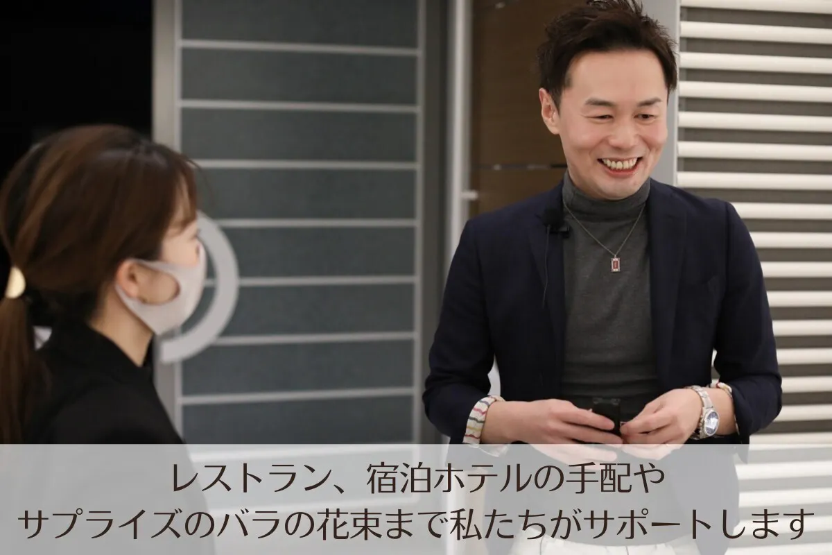 私たちの会社は、コロナ禍以前よりプロポーズ代行事業を立ち上げており、そのプロデュースで最高の思い出を御縁のあった”おふたり”におつくりしてきました。数多くの”おふたり”様が、本当に弊社にお願いしてよかったと仰っていただけたこと、我々としても幸せにおもっております。
