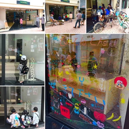 2018/04/03 05:222018年4月1日(日)、『オレンジカフェさいき』の後、春祭りで人通りが多いこともあり、なかまち商店街にある店舗で過ごしました。当事者がウィンドウに消せるクレパス(kitpas)で描いた絵を観て、ひとりふたりと子ども達や親子連れが集まり、店の前は人だかり♫2時間ほどでステキな作品の完成です✨皆さん、とんとんとんの活動に興味津々…ある小学生からは覚えたての知識で「お小遣いがないから小学生未満は無料にしでください!」と…思わず「以下やろぅ⁉︎」と突っ込みました(笑)とんとんとん広場では『とんとんとん寺子屋』の日もあって宿題を教えてくれることを話すと喜んでいました。すでに、年齢や障がいの有無を超えた共生の場でした♡ もっと見るとんとんとん広場…プレopen♡