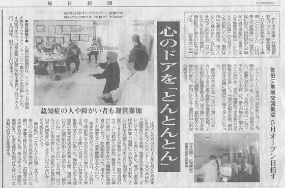 2018/03/11 00:56佐伯に地域交流拠点 5月オープン目指す!! 心のドアを『とんとんとん』 毎日新聞 2018年3月10日 朝刊に掲載頂きました。 臼杵市の障がい福祉課や自立支援協議会の方々とのご縁で、臼杵市での精神障がい者を中心とした「カラフルカフェ」にも関わらせて頂いています。その講演会でお話しした際に、聴講いただいていた記者の方が私どもの取り組みに興味を持って頂き、その後の「オレンジカフェさいき」にも見学にいらして頂き、今回の記事になりました。 ご縁に感謝です♫ もっと見る