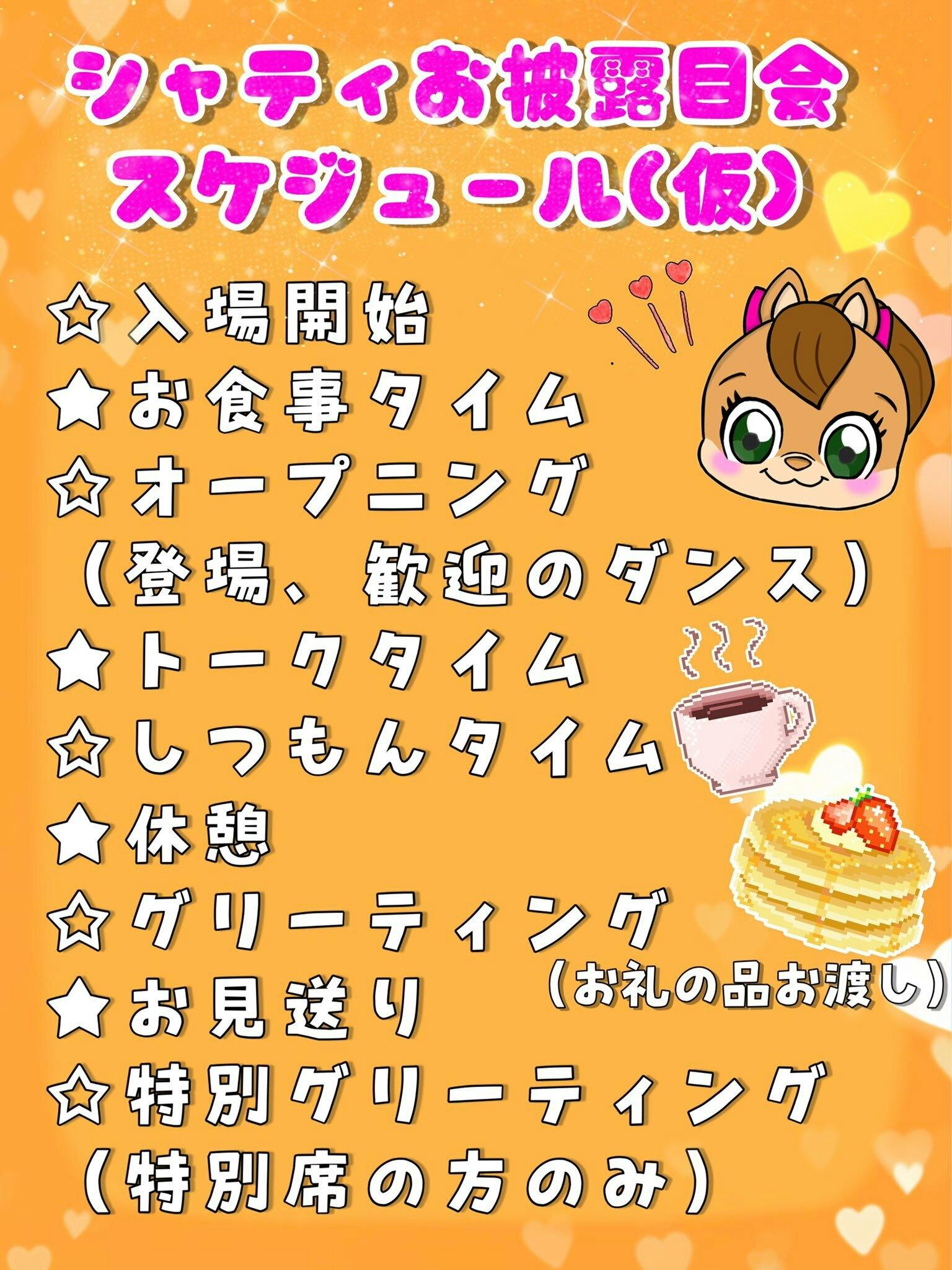 2022/09/02 00:42リターンで1番のおすすめ!シャティのデビューイベントであるお披露目会のスケジュール(仮)が出来たので公開します(^ ^)お食事はその日限定のシャティをモチーフにしたメニューが登場!(お料理のご注文は別途料金がかかります。)グリーティングでは撮影会や2ショット写真撮影会もできます。楽しくてワクワクしちゃう内容が盛りだくさん♪是非皆さまのご参加おまちしております!! もっと見る
