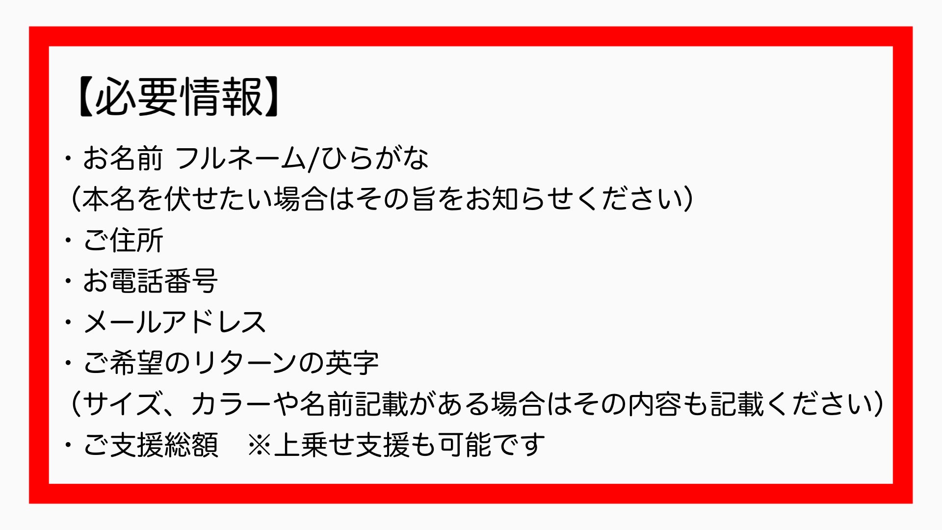 ①下記の必要情報をメールにてお知らせください。banhiroshi.cf@gmail.com
