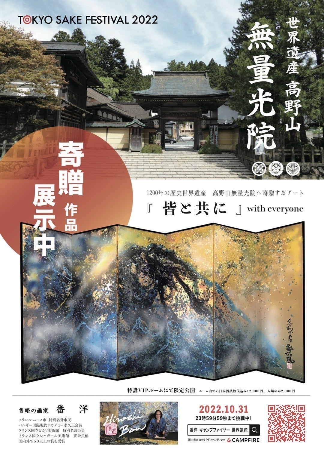番洋 白石眞弓 世界遺産 キャンプファイヤー 高野山 無量光院 クラウドファンディング 展覧会 隻眼の画家 皆と共に 土生川正道 2100 アルグラッドザタワー 涼水 RYOUSUI 寄贈 平和 日本酒 ギャラリー リターン 金屏風 支援者 支援金 寄付 生涯描く リトグラフ 額縁 アート 寄付金 屏風 金屏風 バーチャル美術館 CAMPFIRE 資金調達 お供え ラファエル YOSHI りょうたす インプレッションアート 世界平和 PRTIMES プレスリリース 益田アンナ 彩希エリナ ETキング 緑川静香 高橋名人 TEE