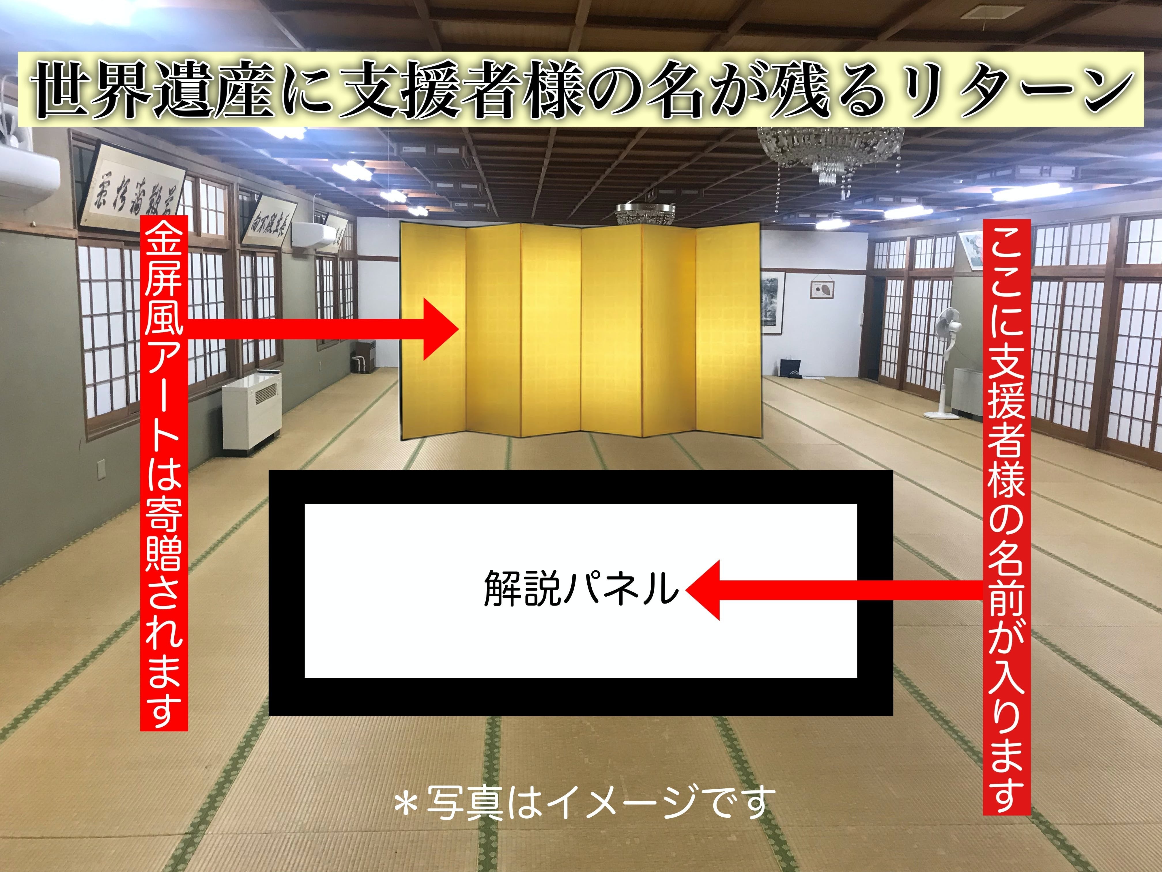 私達が一番メインにしているリターンがやはり無量光院様に金屏風を寄贈して、皆様の名前が解説パネルに残るという内容です。