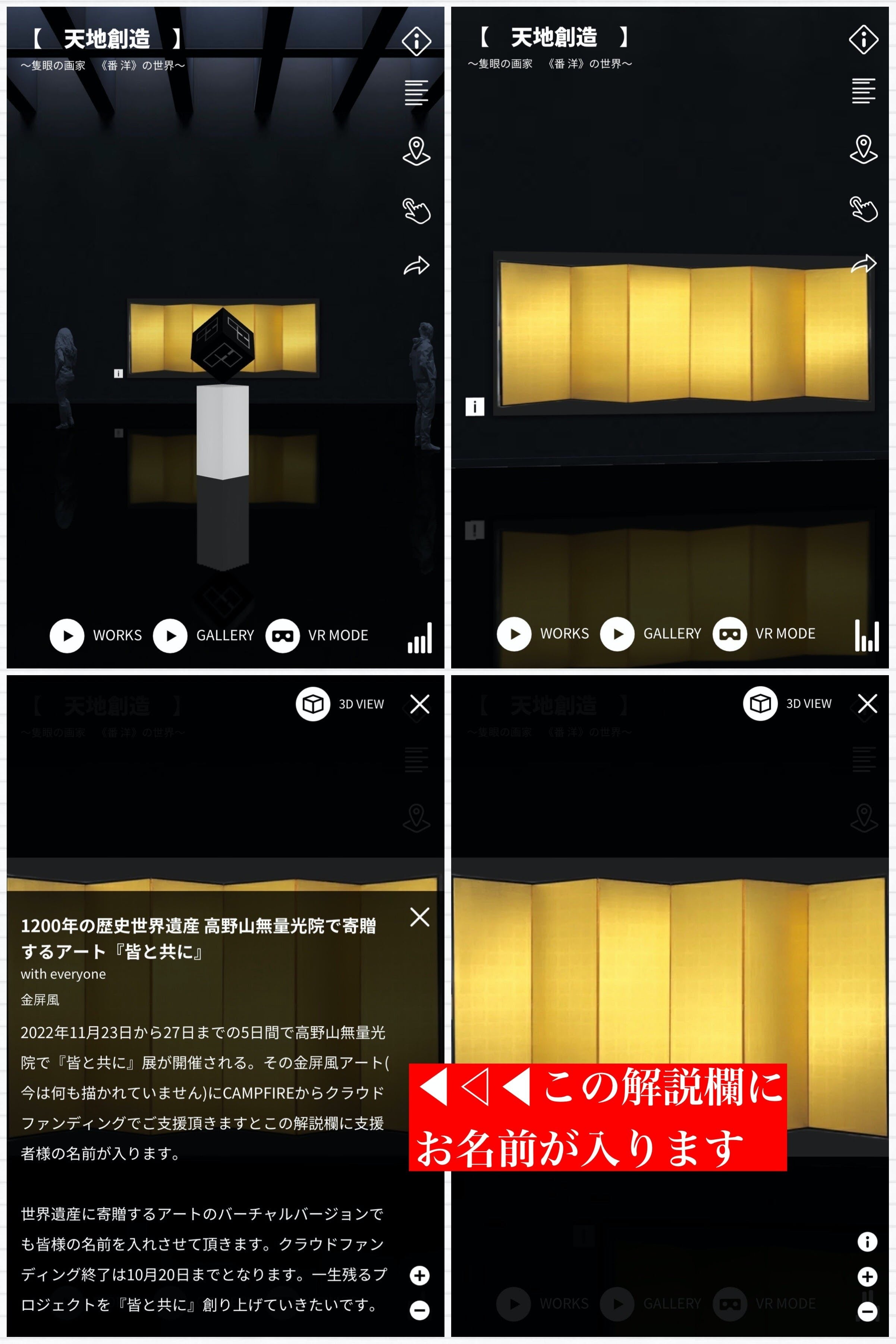 そして、バーチャルの世界でそのまま真っ直ぐ歩いて行き、金屏風をクリックしたら解説文が表示されそこに支援者様の名前が記載されます。文字数制限があり50名様までとなります。