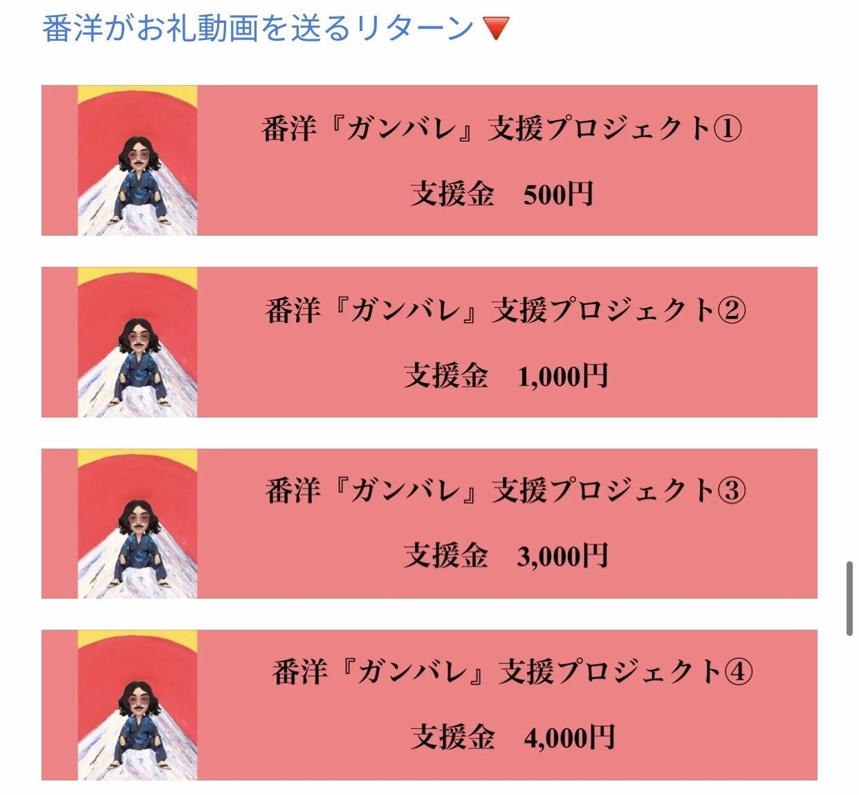 20以上のリターンの中に番洋『ガンバレ』支援プロジェクトがあります。